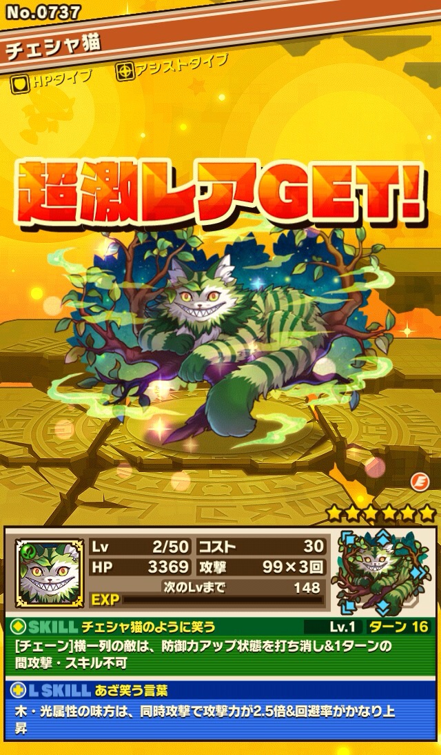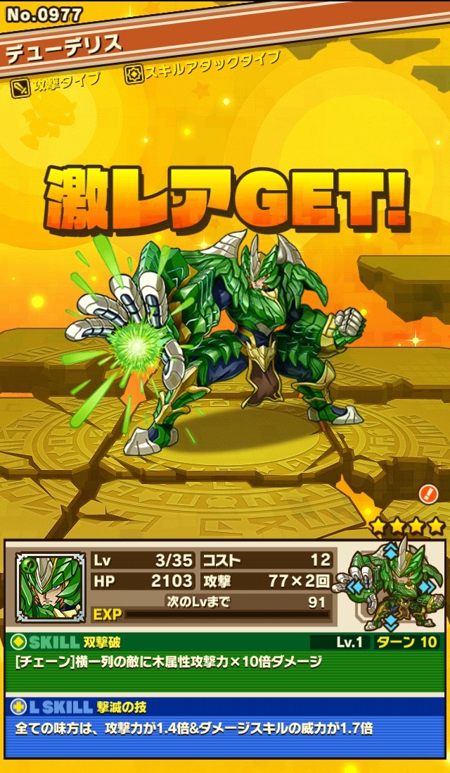 イシスをリーダーに、マールス、青龍、ヘルキマイラを入れたアタックPTで使ってみようかと思います。初ゲットモンスターが3体いるのは何かの運命かしら。…にしても初ゲットのモンスター、全部アタックタイプだったとは笑 育成頑張りマッシュ!