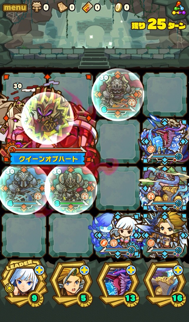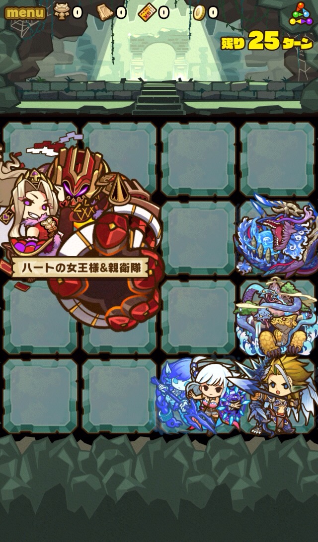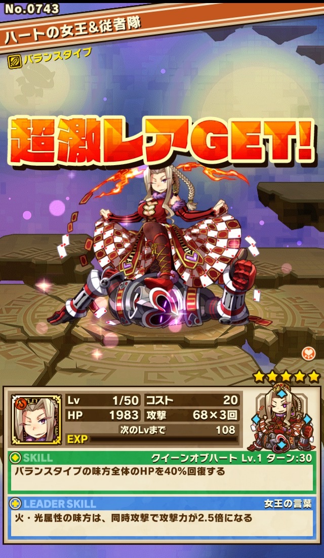 ハートの女王もゲット。30ターンかかるのはいただけないけど、バランスタイプのHP40%回復は強い。…ただ進化後の矢印が4方向のままなのが、あかん!笑 変なバランス調整は、運営の悪意を感じますね。