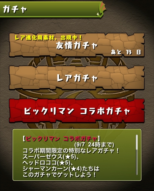 25日から始まった、ビックリマンコラボガチャ。今回のガチャはどれも使いやすくて強い印象がある。その中では、5色で5倍のLスキルを持つ、シャーマンカーン。銀卵ながらぶっ飛んだ性能。強い。進化したら覚醒スキルに捜査時間延長もつく。