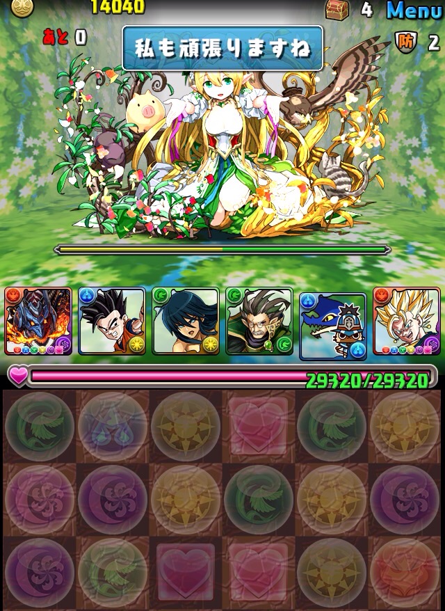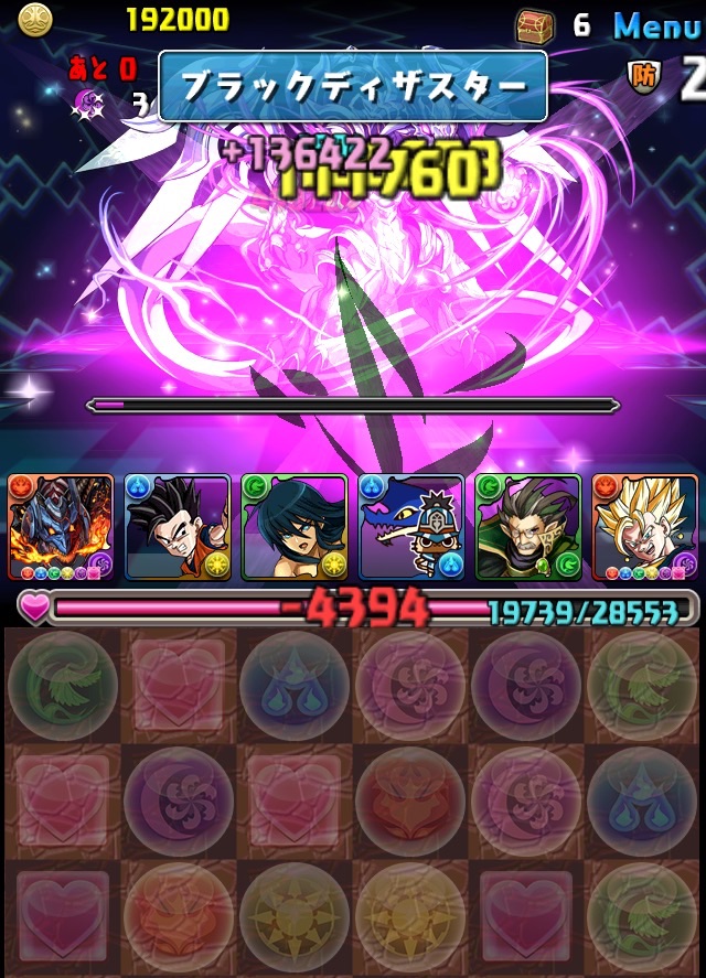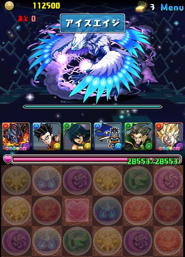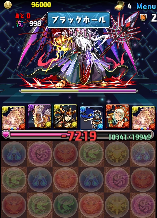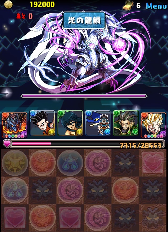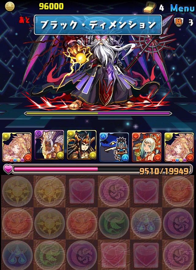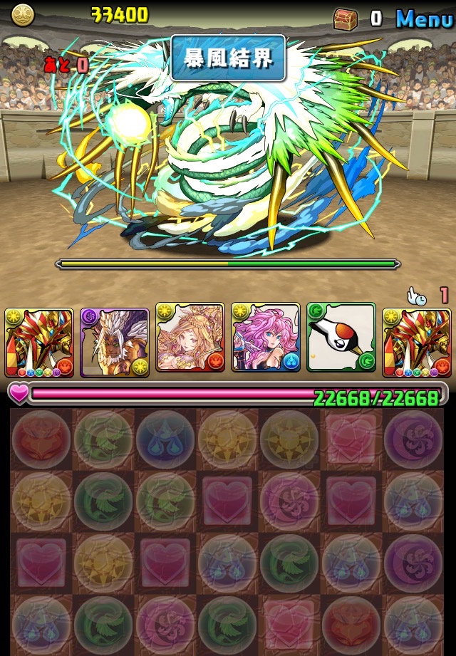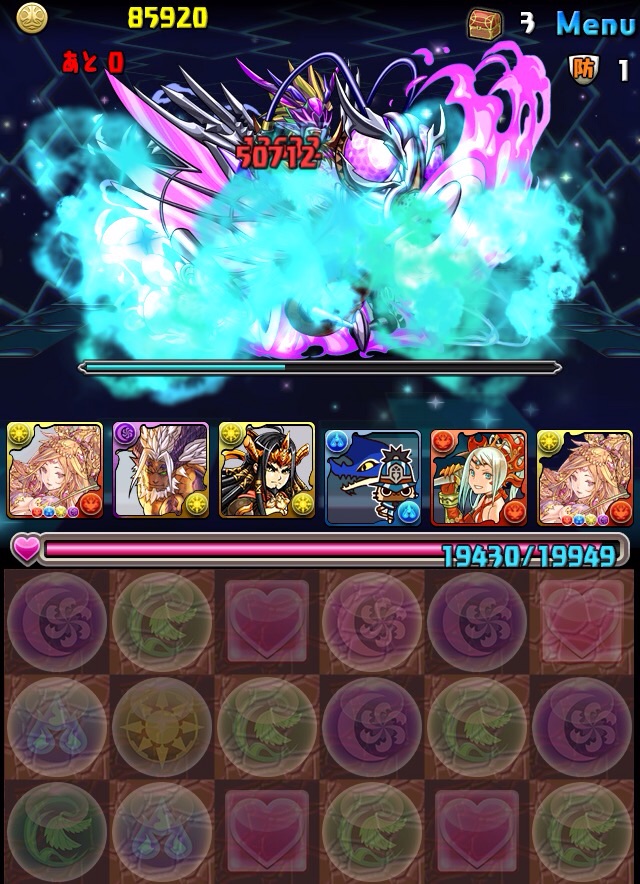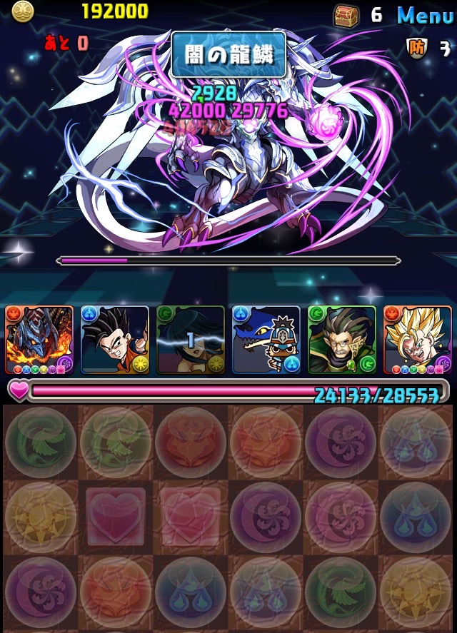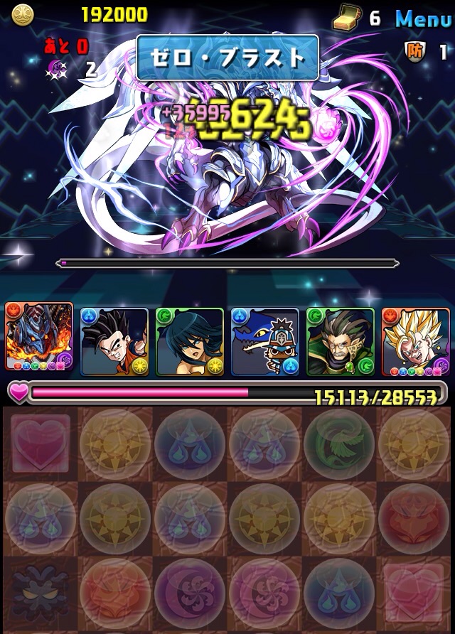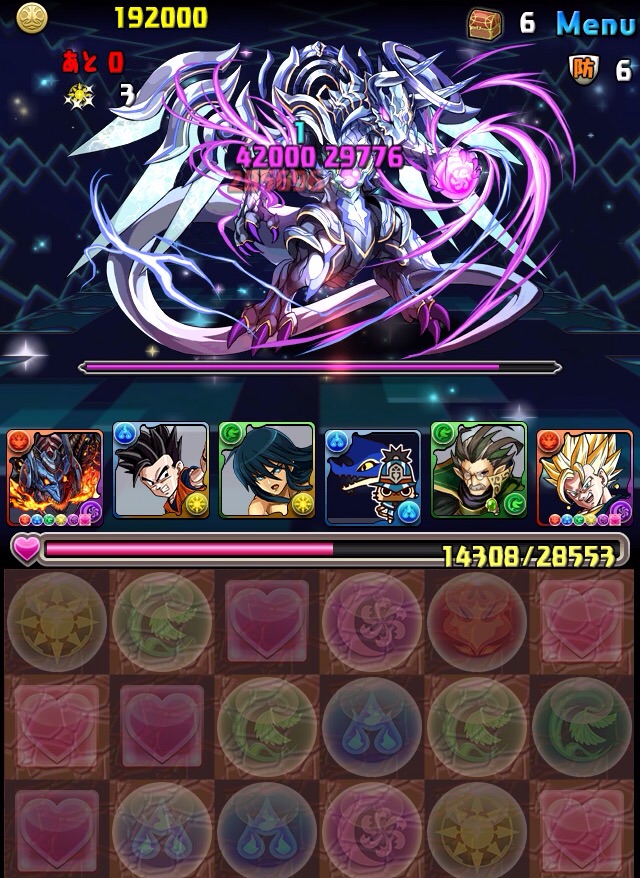 ボス。ゼローグ。ランダムで、先制で光か闇を吸収してくる。このPTは副属性に光闇それぞれ2つずつあるので、下手したら回復されるから要注意。主属性は3色なので戦いやすいはず。