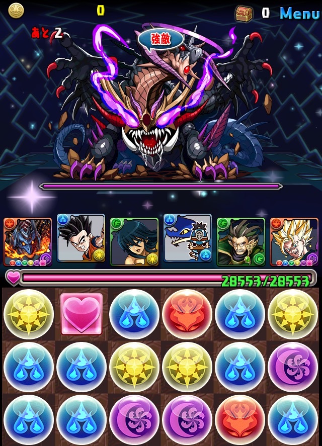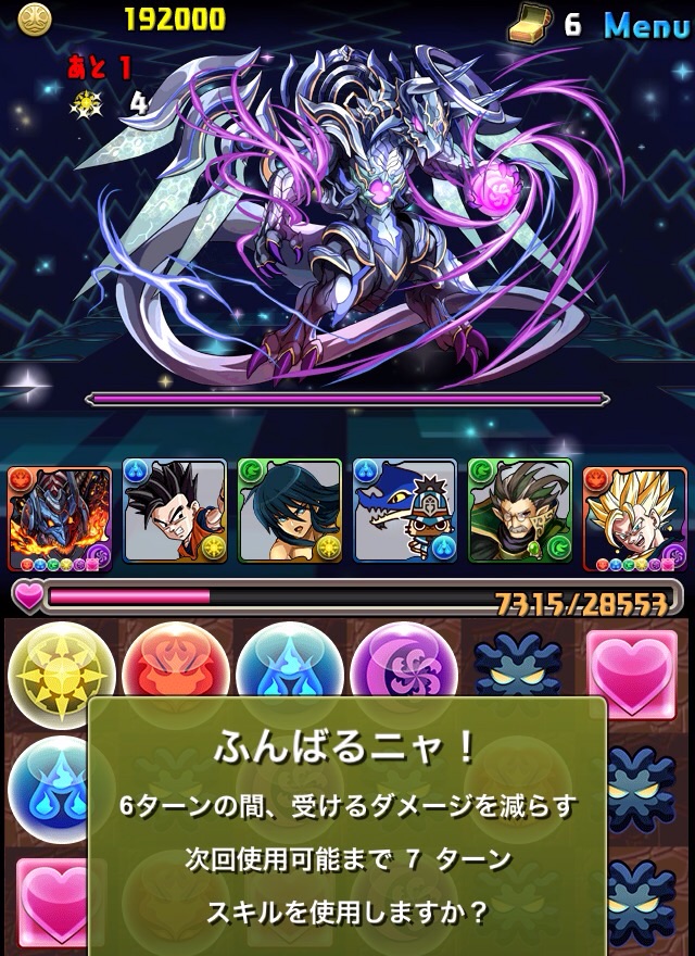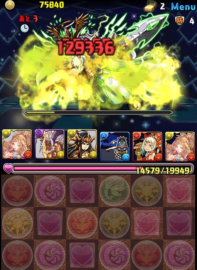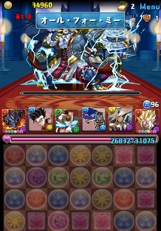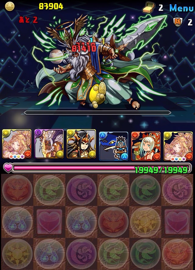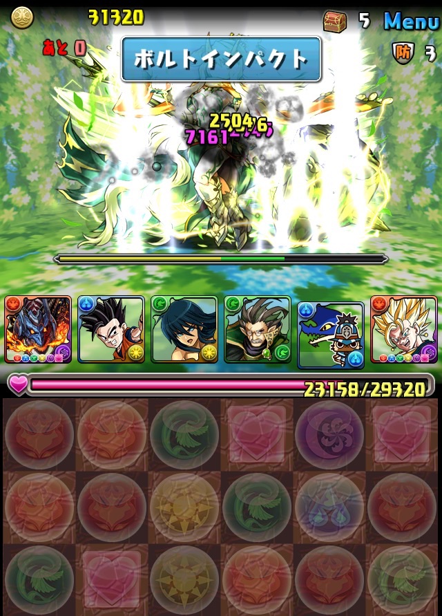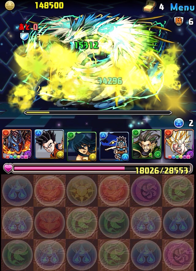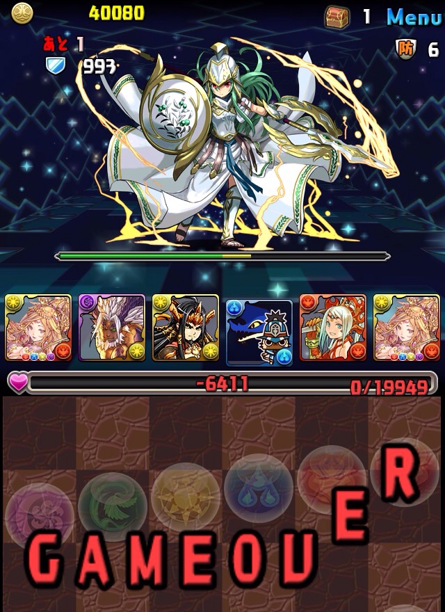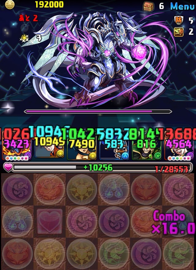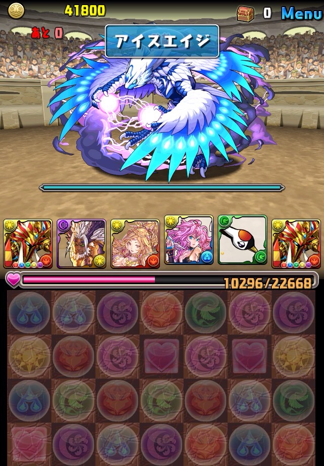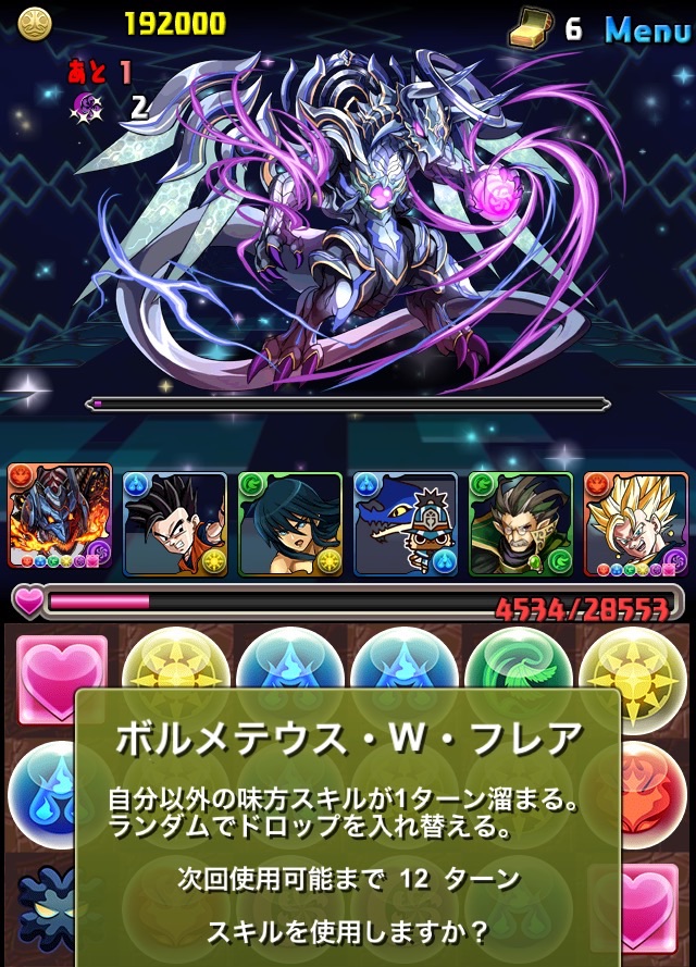 ボス。ゼローグ。ランダムで、先制で光か闇を吸収してくる。このPTは副属性に光闇それぞれ2つずつあるので、下手したら回復されるから要注意。主属性は3色なので戦いやすいはず。
