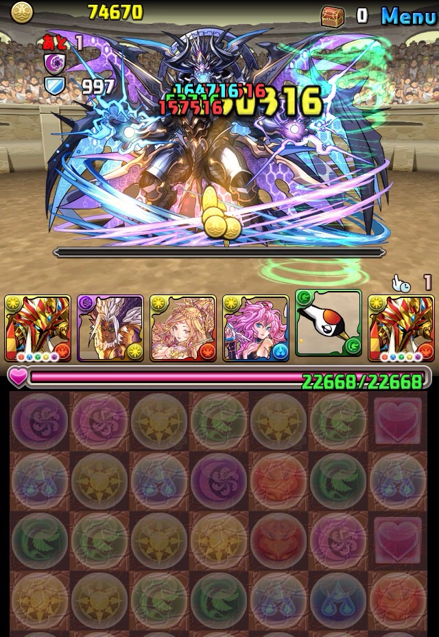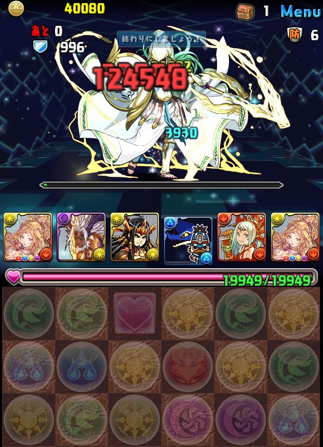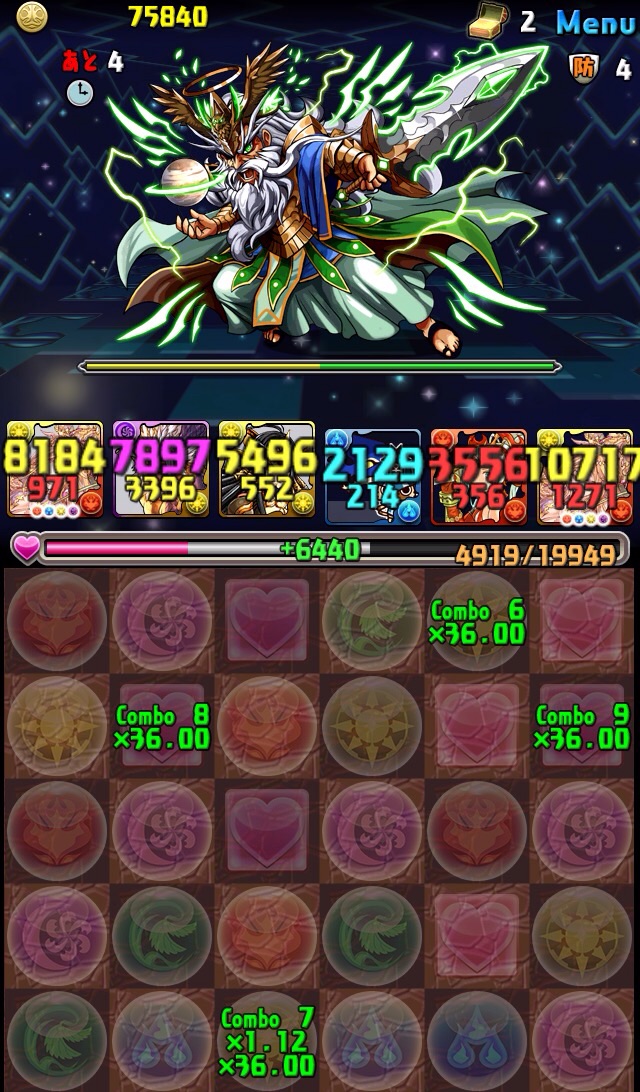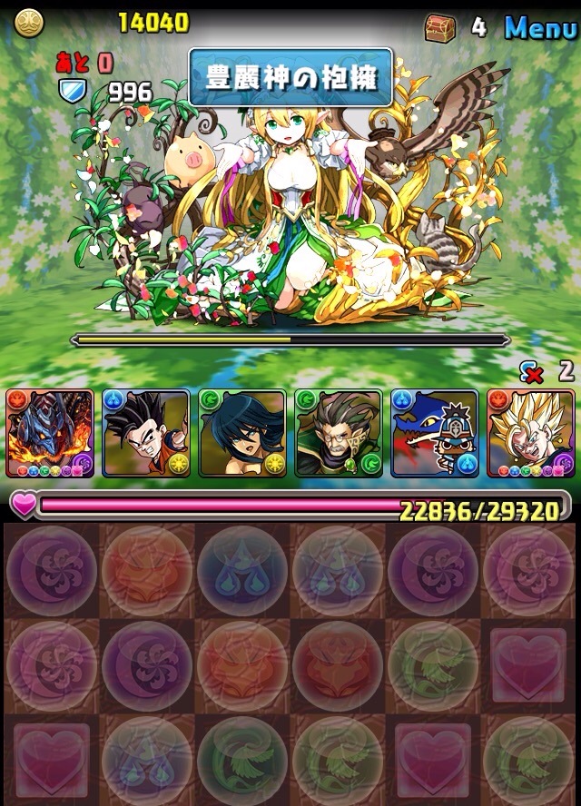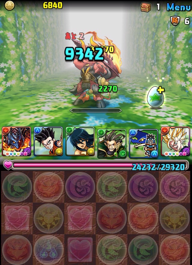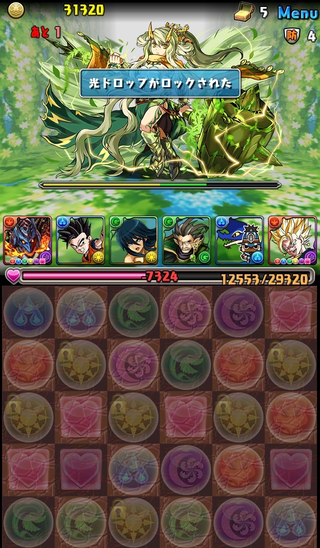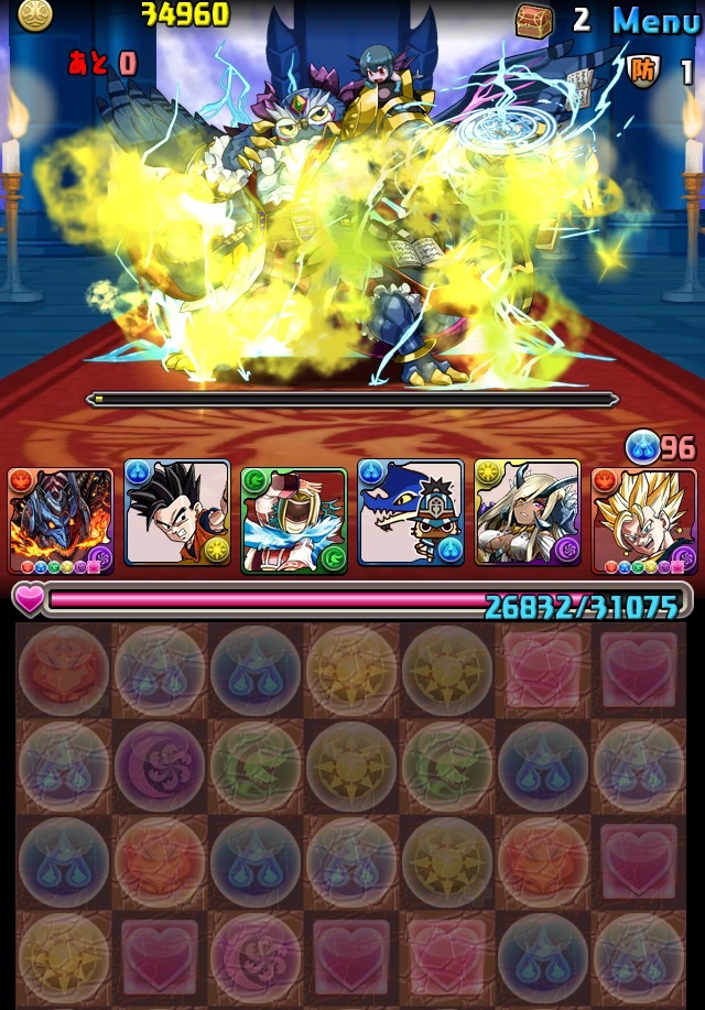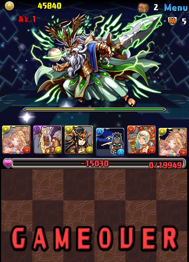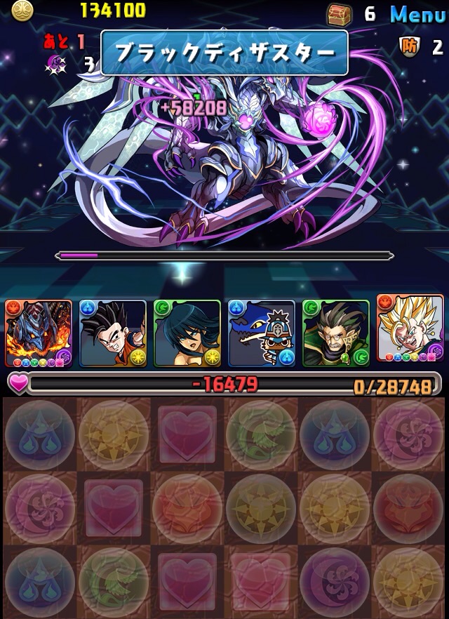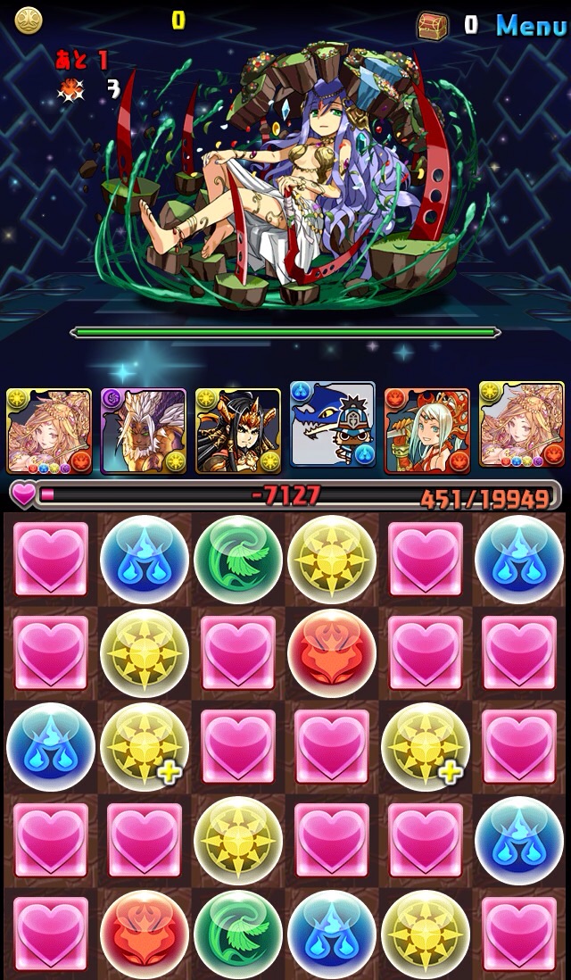 ボス。ゼローグ。ランダムで、先制で光か闇を吸収してくる。このPTは副属性に光闇それぞれ2つずつあるので、下手したら回復されるから要注意。主属性は3色なので戦いやすいはず。