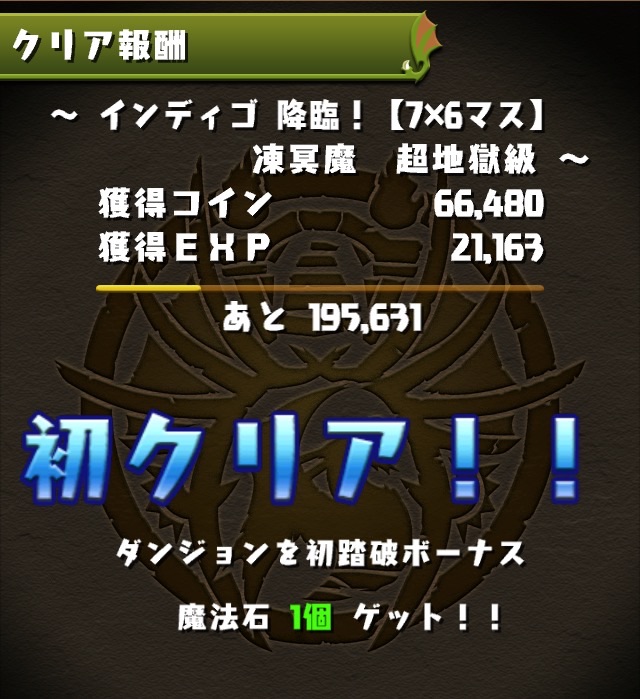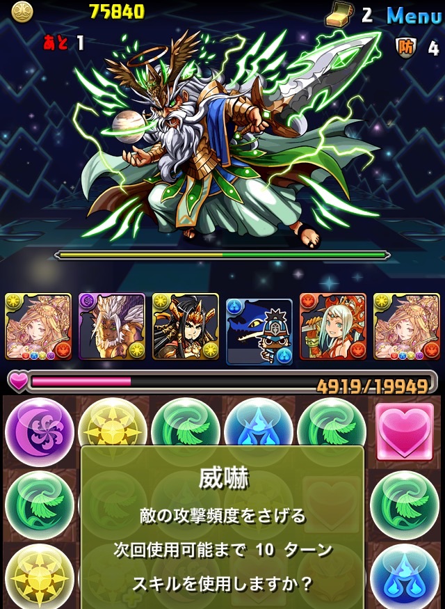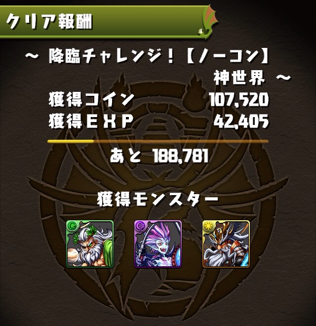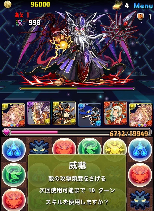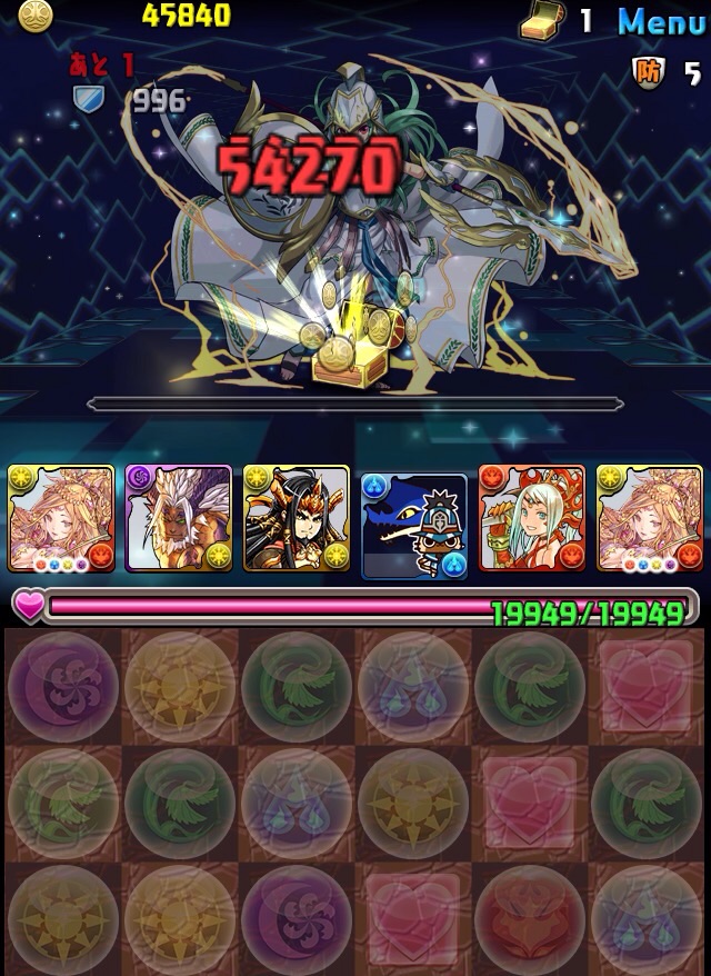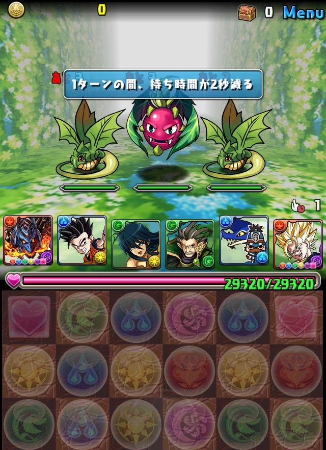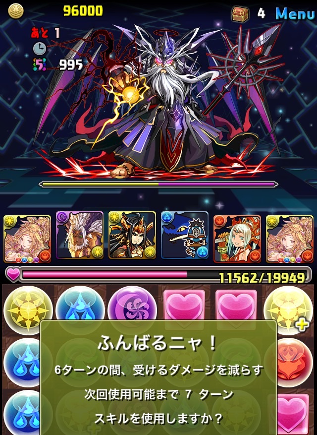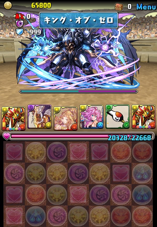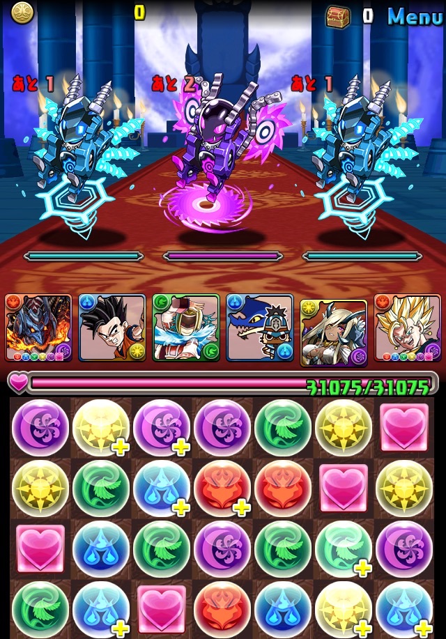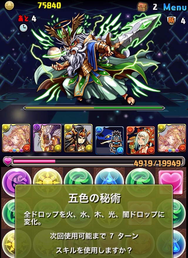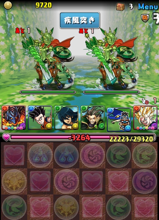 ボス。ゼローグ。ランダムで、先制で光か闇を吸収してくる。このPTは副属性に光闇それぞれ2つずつあるので、下手したら回復されるから要注意。主属性は3色なので戦いやすいはず。
