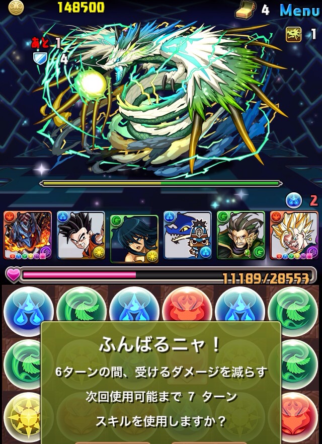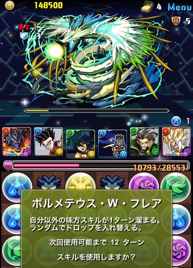 HPが非常に高いため、2回挑んだ時は開始早々から廬山昇龍覇を使ってたけど、その使うタイミングを今回は変更。まずは普通に殴ってみて、次のターンで突破する時に2ターンエンハンス→回復しつつ突破→次のバトルで全力パズルで削れる所まで削る、というプラン。