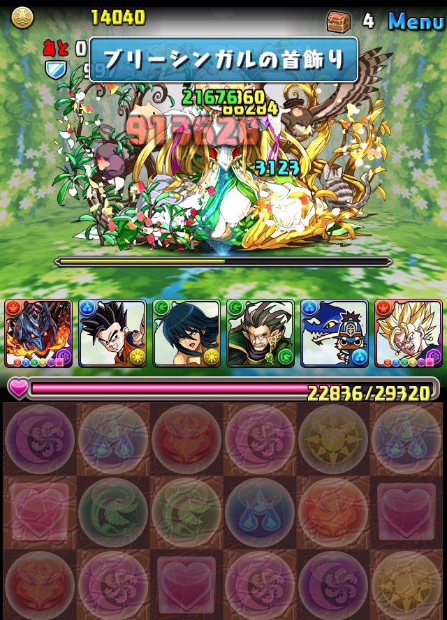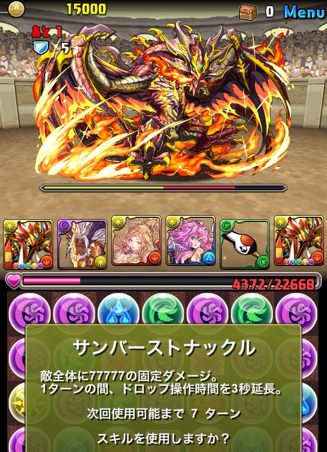 最初はこんなダメージ。だが徐々に増え、5回目の攻撃で受け切れないダメージが飛んでくる。あと火ドロップを作ってきてくれるので非常にありがたい。