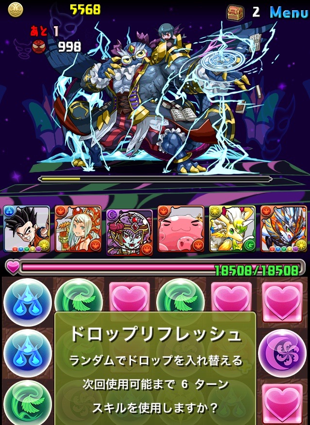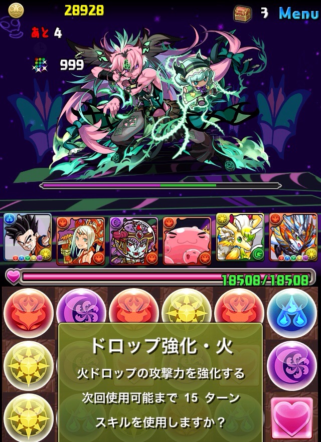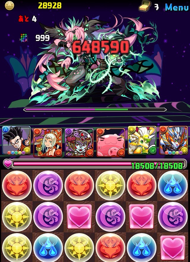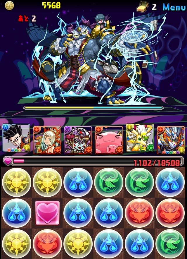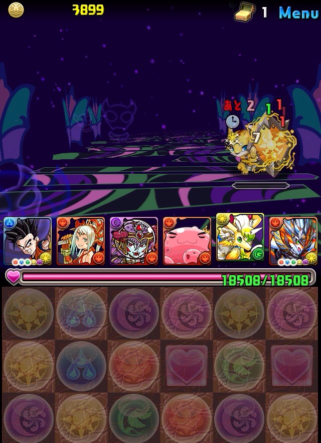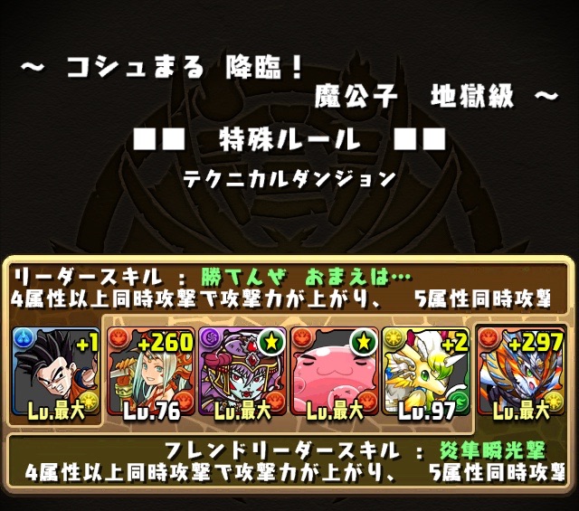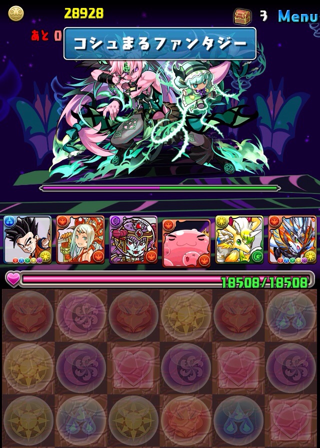 初見。何のデータもない状態での挑戦なため、何が来るか分からない。最近はこの悟飯をリーダーにした多色PTを多用している。いつもならワダツミを入れている自分の中のテンプレがその形なのだが、今回のボス コシュまるは木闇なため、ヘラマリアを採用。2way、スキブ、操作延長を持つ。スキルは自分の攻撃力200倍の火属性ダメージを与える、実質プチギガグラ。