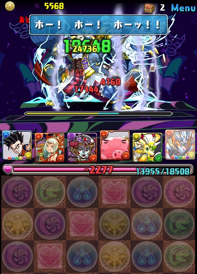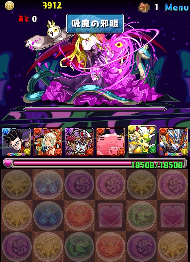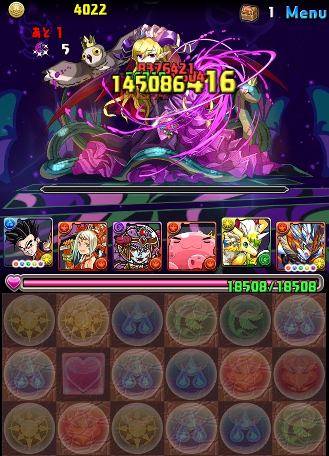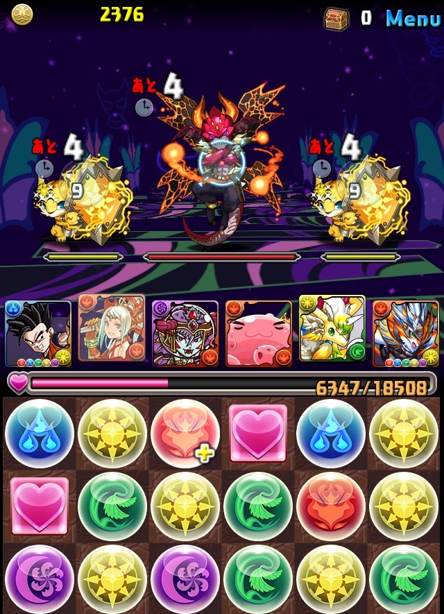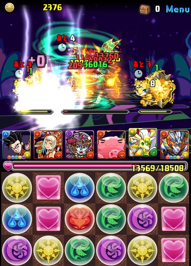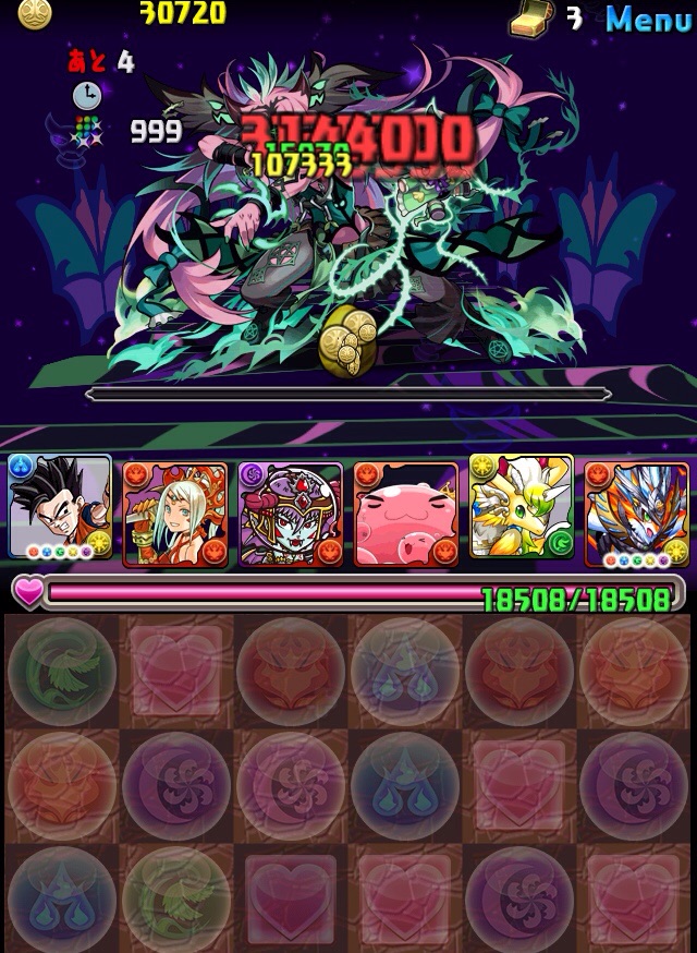 初見。何のデータもない状態での挑戦なため、何が来るか分からない。最近はこの悟飯をリーダーにした多色PTを多用している。いつもならワダツミを入れている自分の中のテンプレがその形なのだが、今回のボス コシュまるは木闇なため、ヘラマリアを採用。2way、スキブ、操作延長を持つ。スキルは自分の攻撃力200倍の火属性ダメージを与える、実質プチギガグラ。
