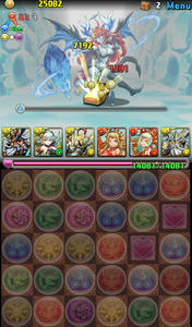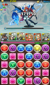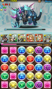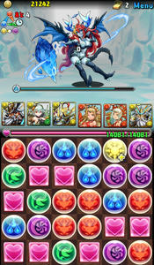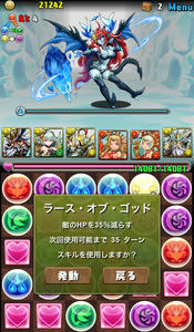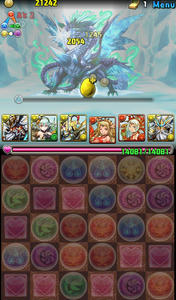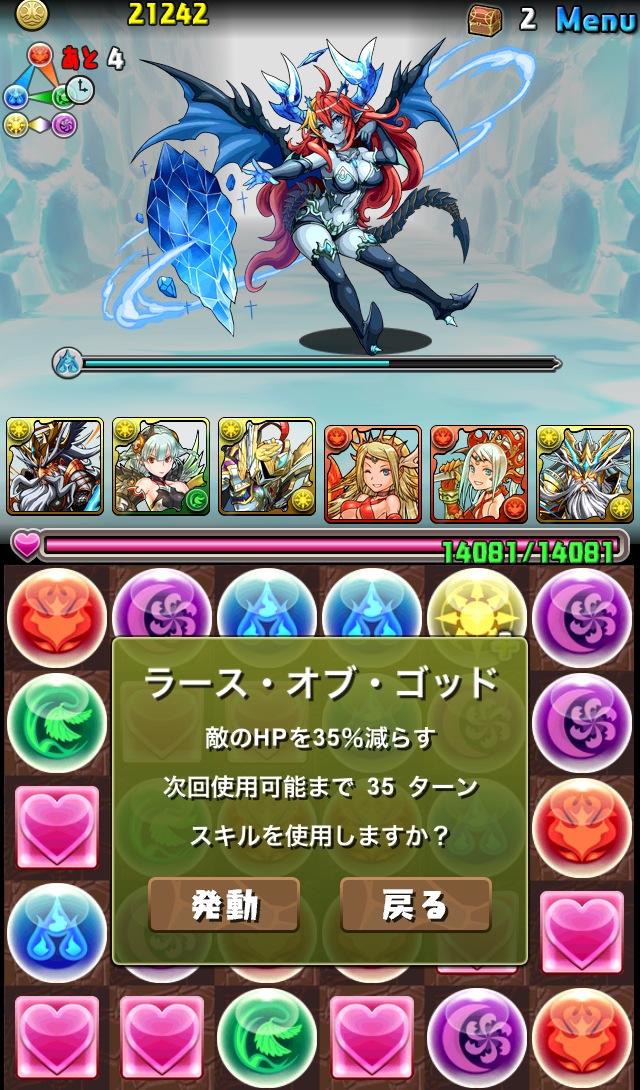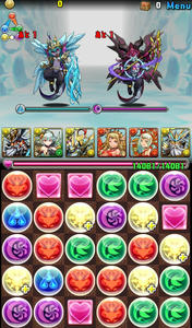バトル1。デーモン2体。このフロアでスキルを溜めていきたい。イメージは、闇デーモンを倒して水デーモン残して溜めようと思ったけど、何コンボくらいがちょうどいいのか分からず、結構全力でパズルしたら、なんと2体ともワンパンしてしまいました笑 こんなに強かったか、ゼウスw