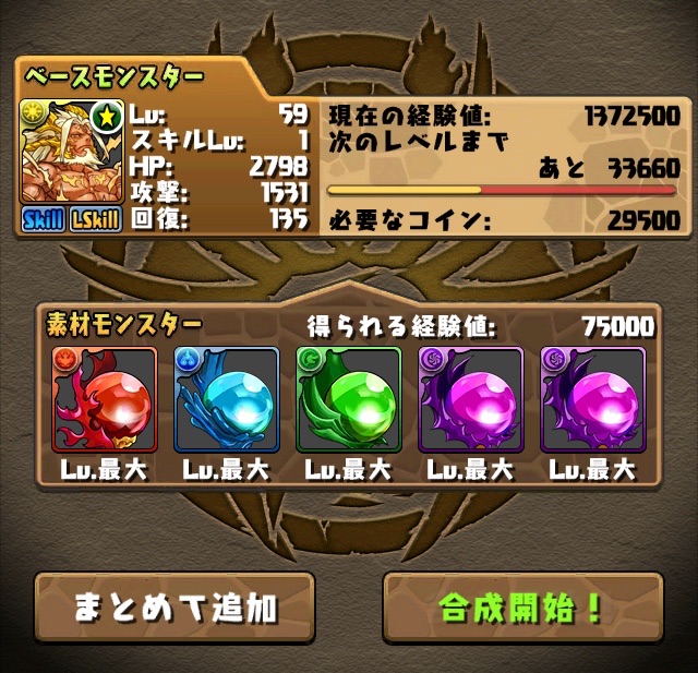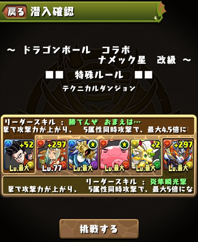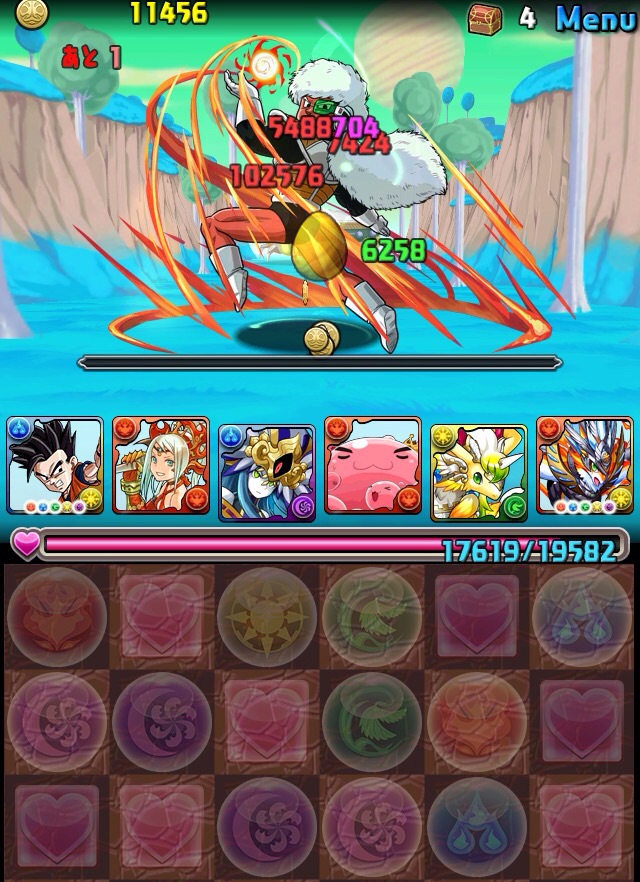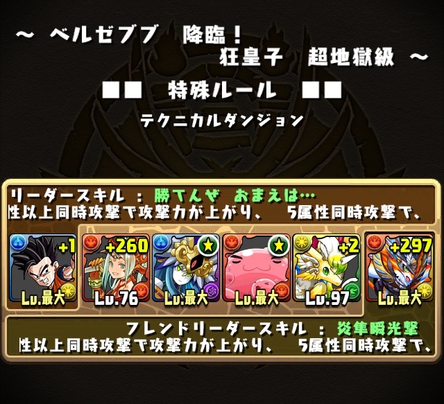 …だが、昔のオレとは違う。孫悟飯を引っさげた5色22.5倍PT。この日3回チャレンジしたが、アモンにやられ、ケルベロスで色欠損、アスタロトのコシュまるにやられ、3連敗。。ベリアルの顔すら拝めず悔しい気持ちがあった。色々サブを変えてみたけど、やはりマスリンは入れた方が良いと思い、火寄せでベルゼブブのHP50%切ったら不利になるかもしれないが、それでもマスリンを信じた。