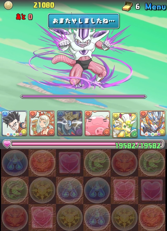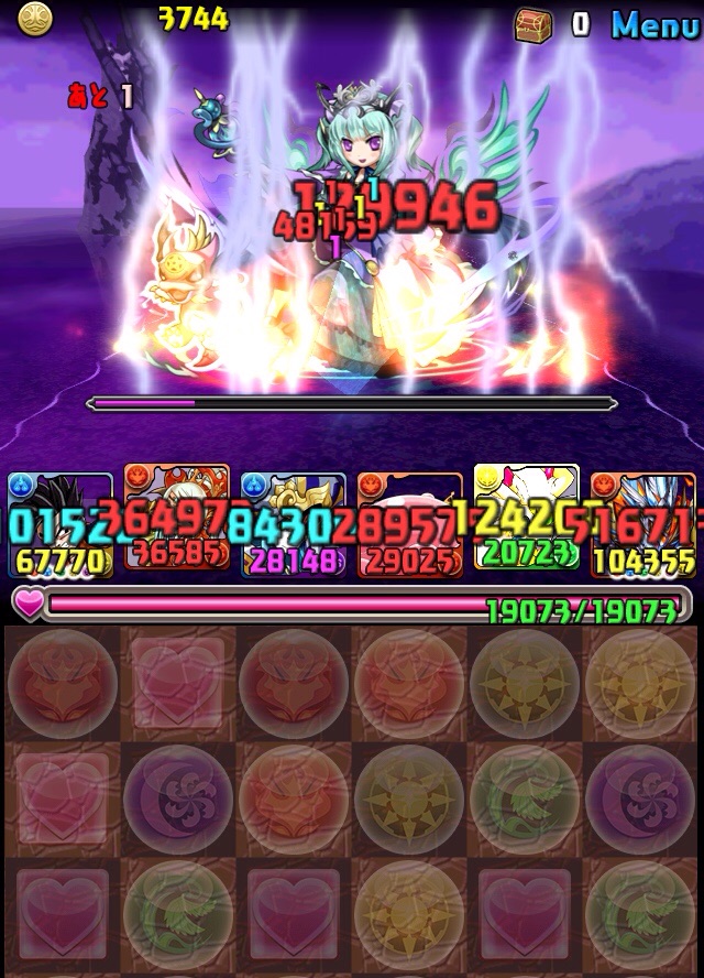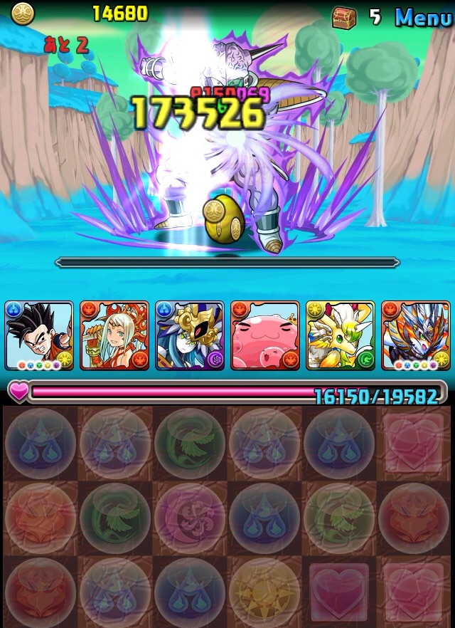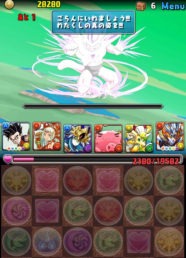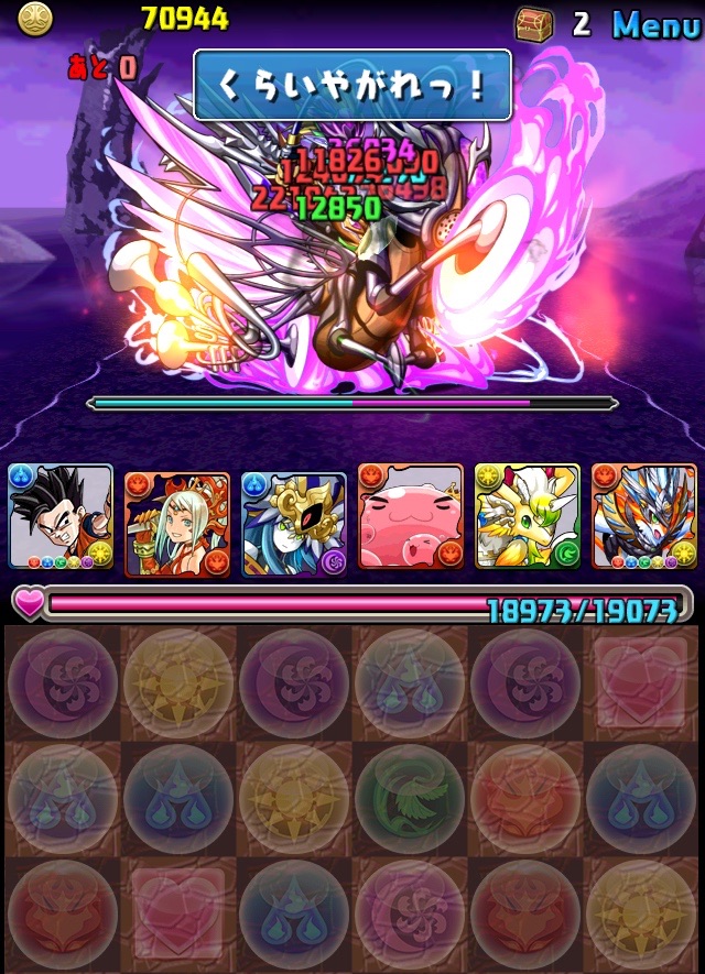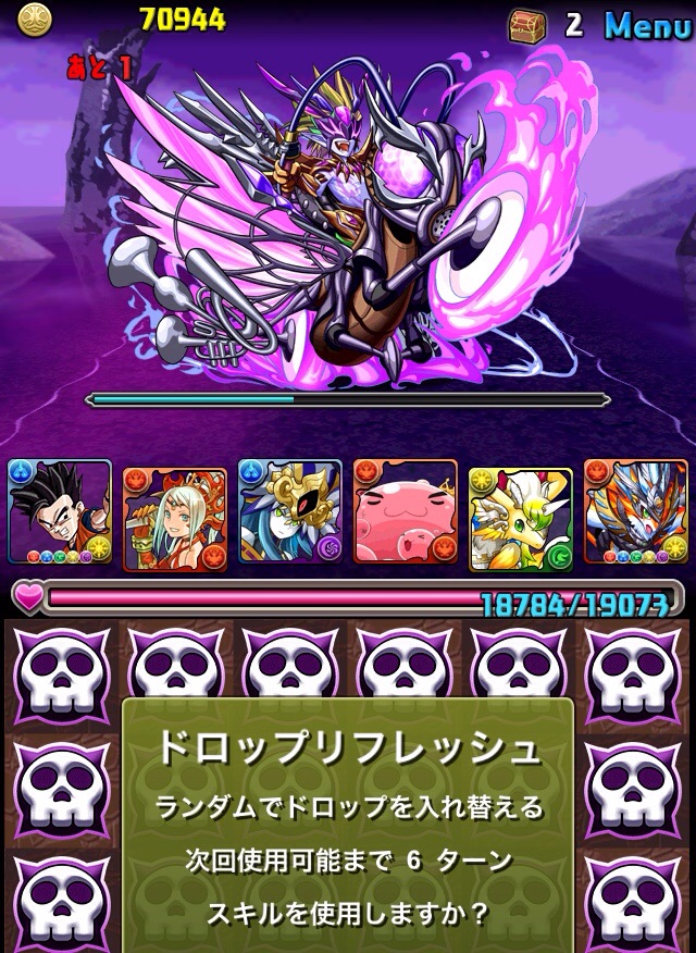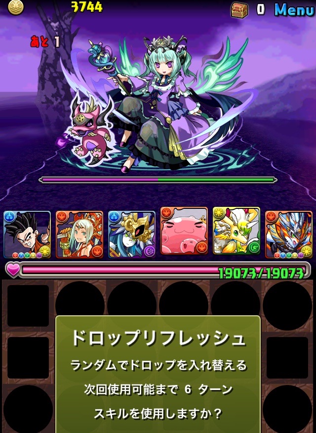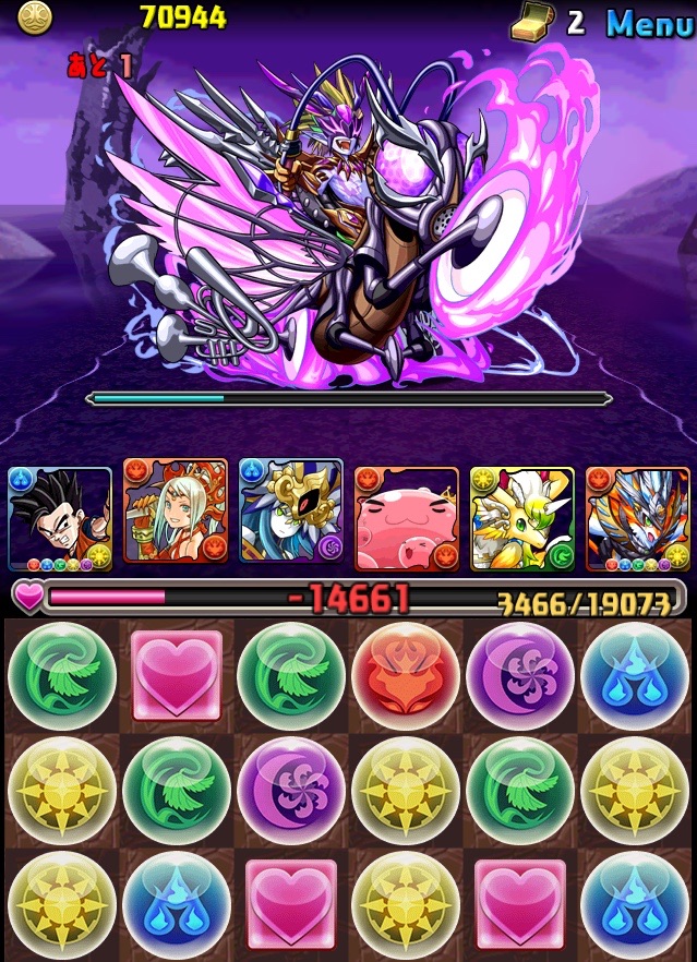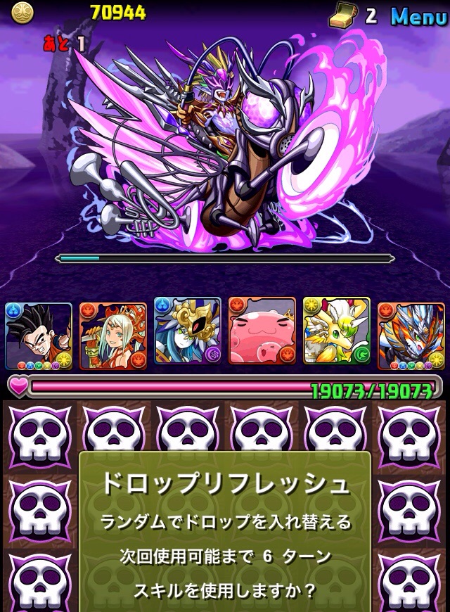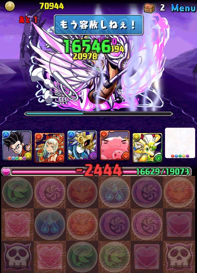 ドロリフで暗闇解除+落ちコンで多少なりダメージ。高防御力で回復ドロップも消して来るし、1発も重いため、非常に手強い。毎ターン5色決めて一気にケリをつけるつもりで、全力パズル!