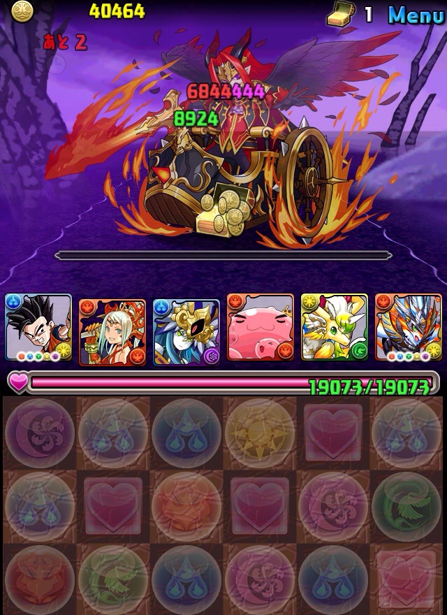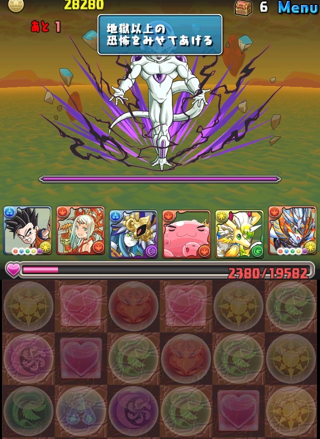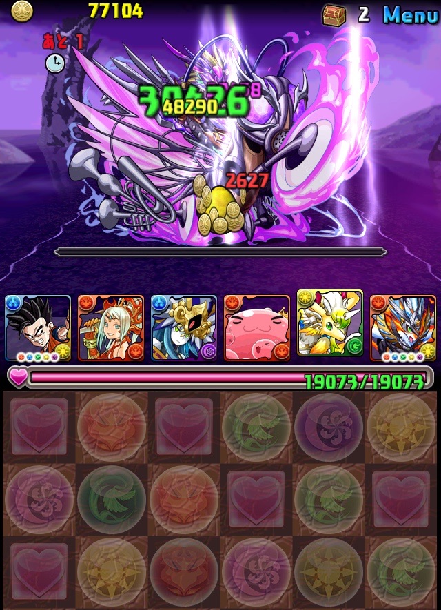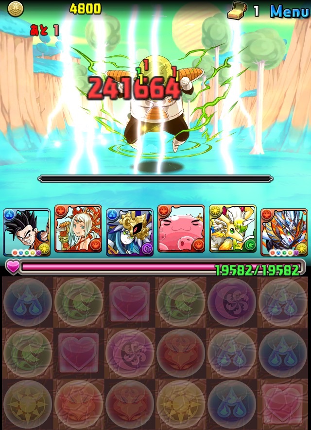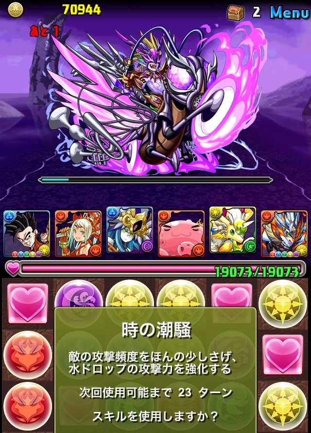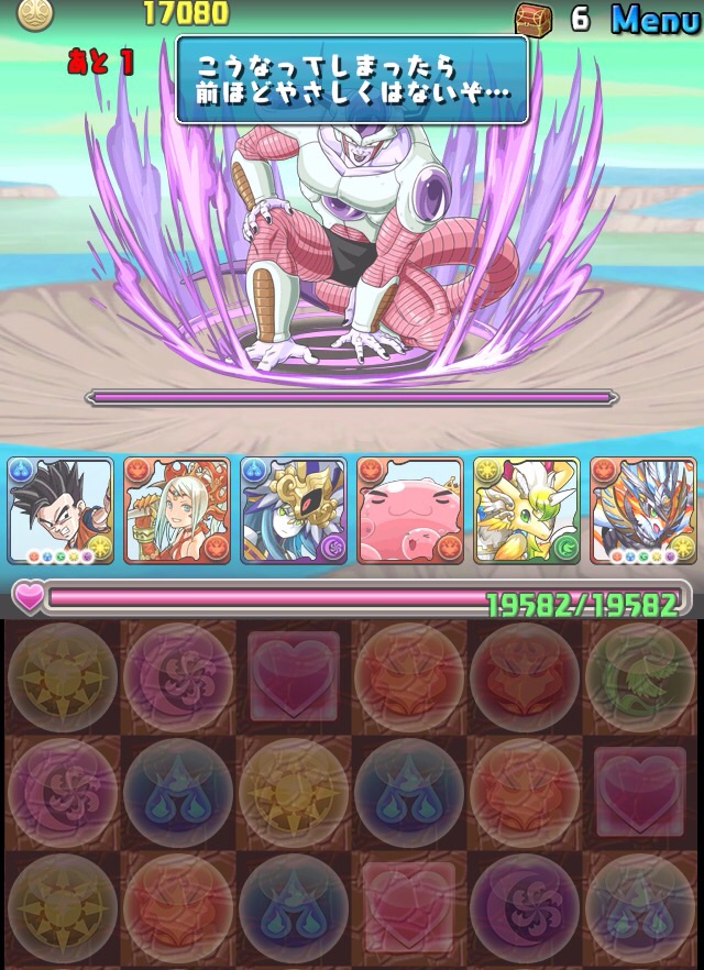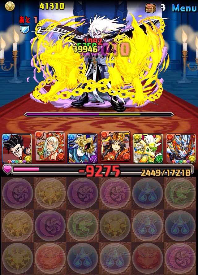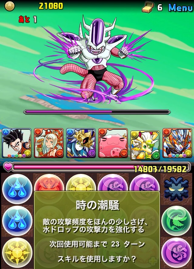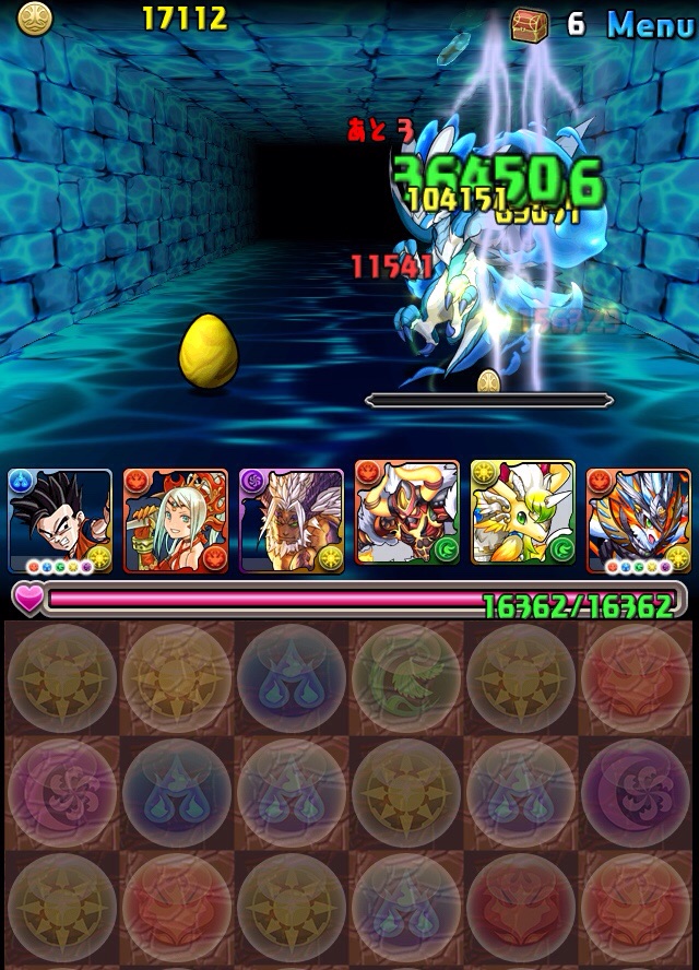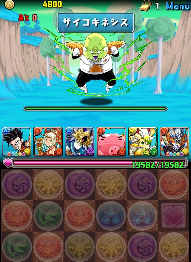 ドロリフで暗闇解除+落ちコンで多少なりダメージ。高防御力で回復ドロップも消して来るし、1発も重いため、非常に手強い。毎ターン5色決めて一気にケリをつけるつもりで、全力パズル!