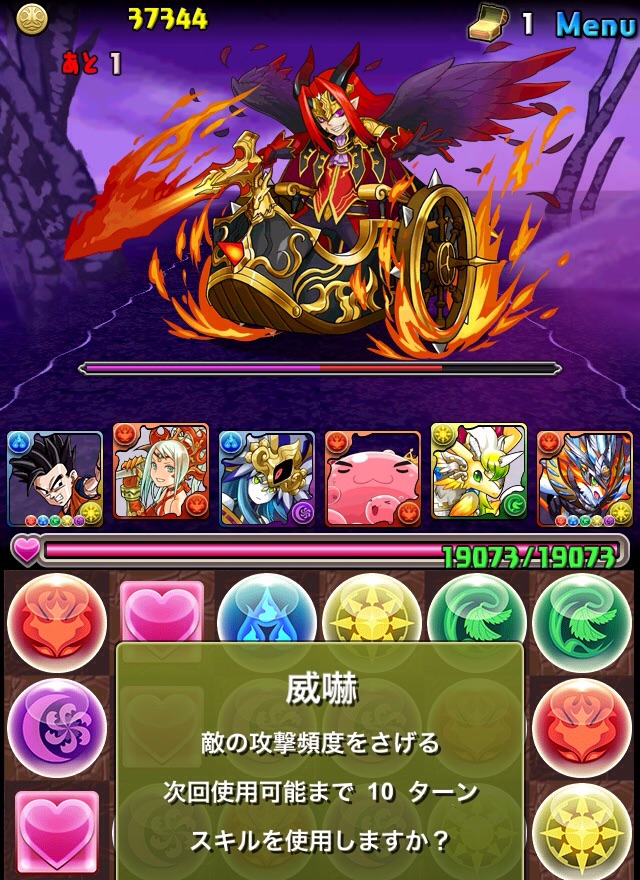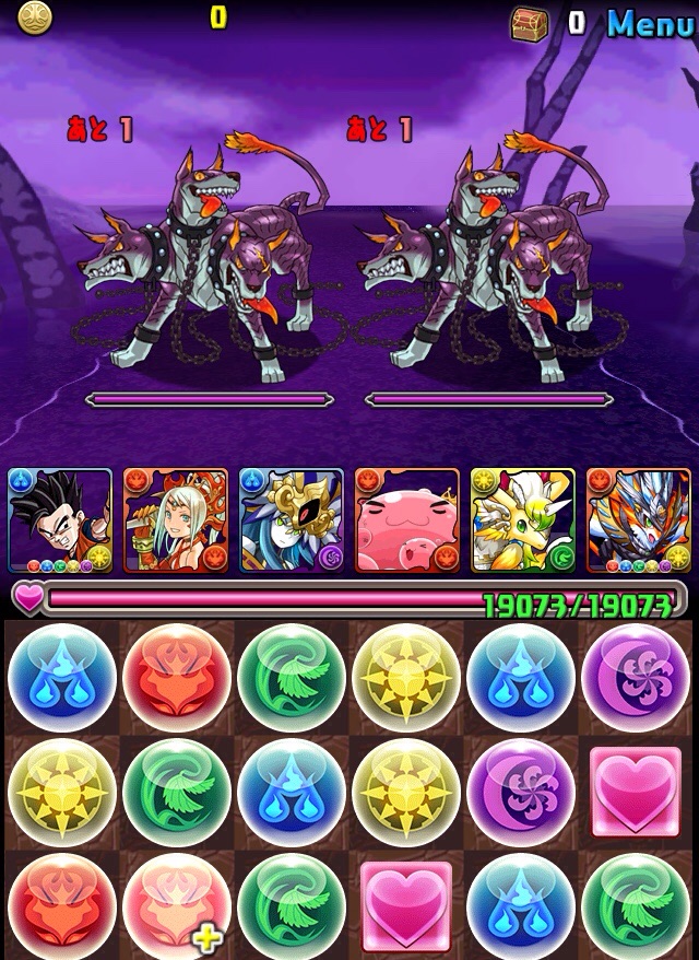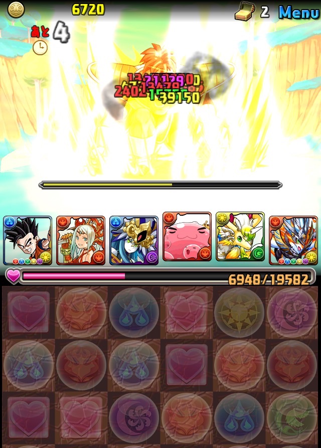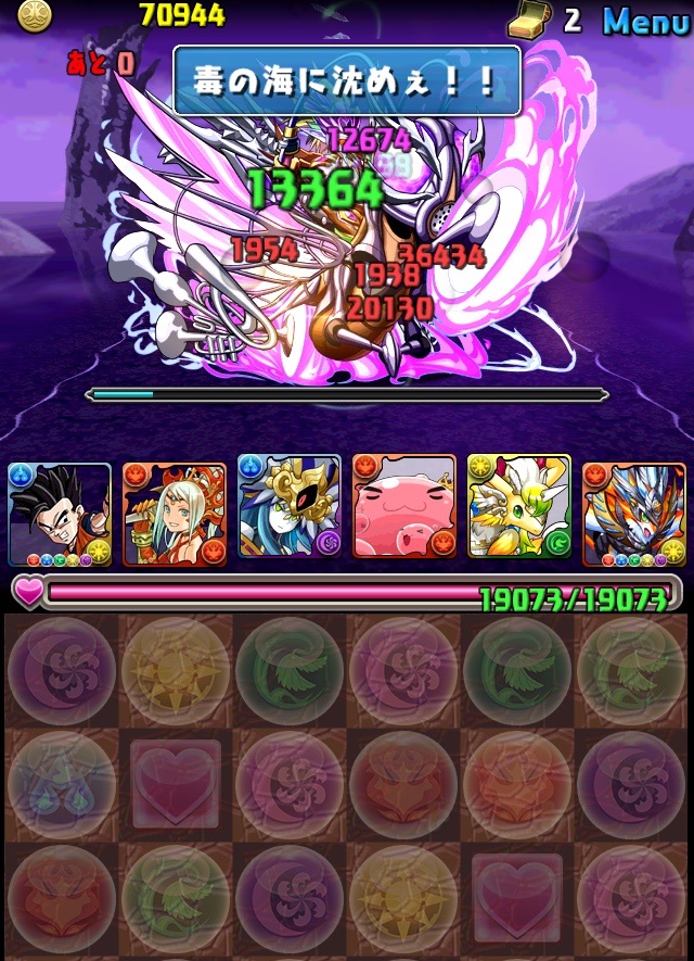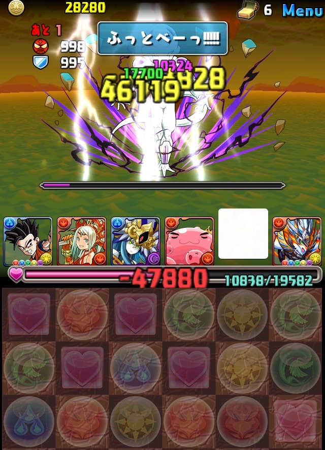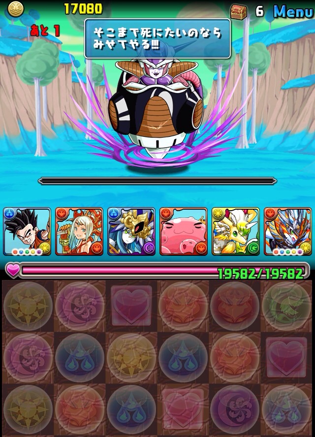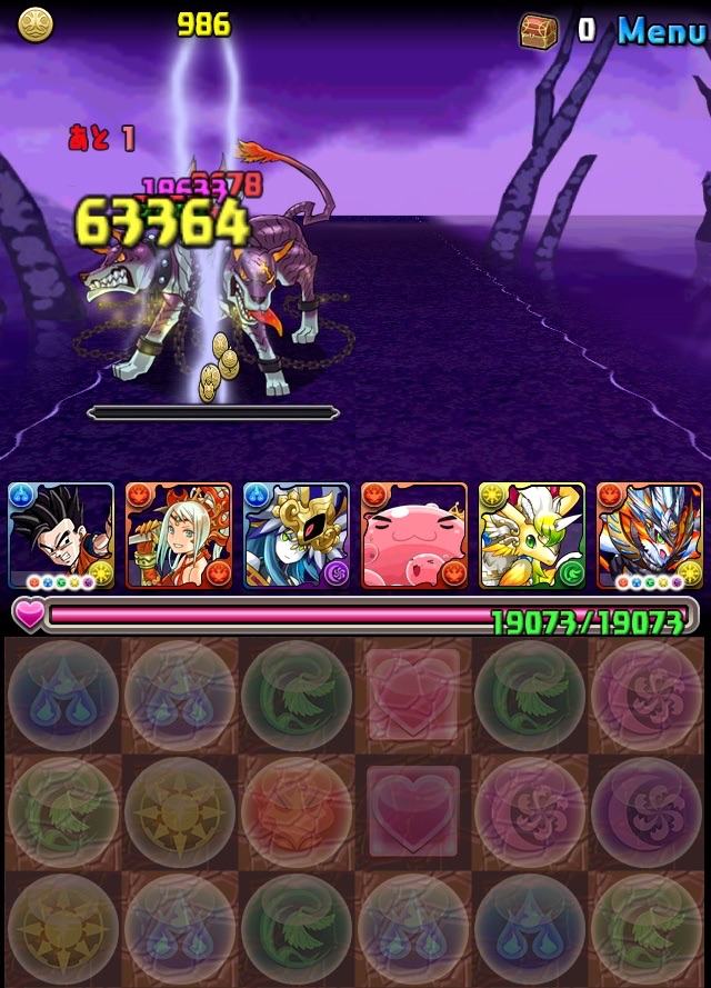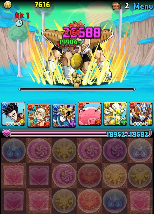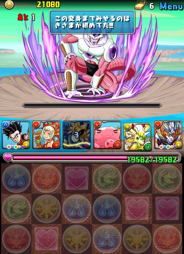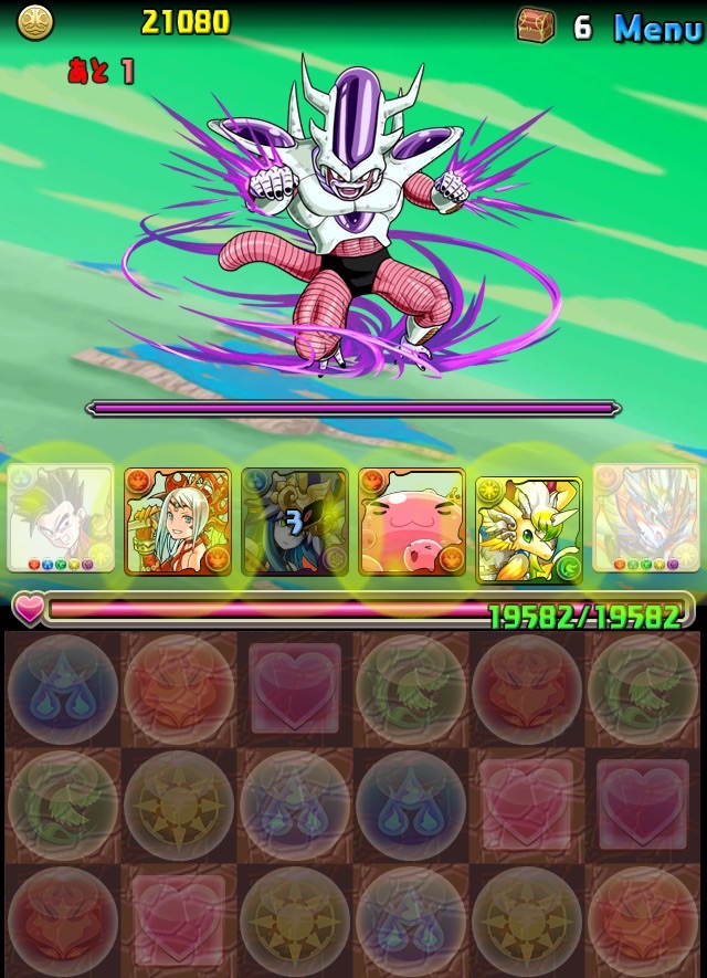 ドロリフで暗闇解除+落ちコンで多少なりダメージ。高防御力で回復ドロップも消して来るし、1発も重いため、非常に手強い。毎ターン5色決めて一気にケリをつけるつもりで、全力パズル!