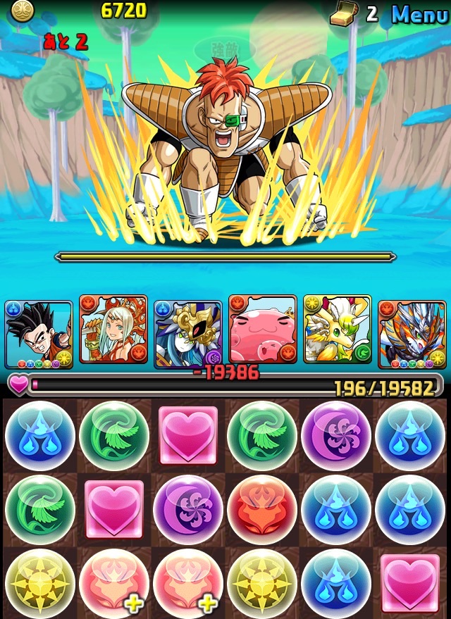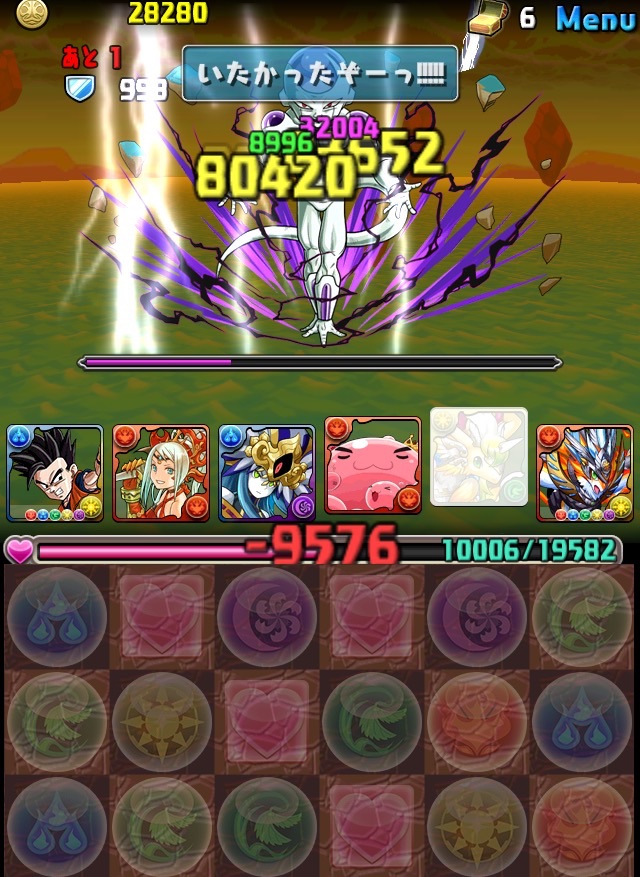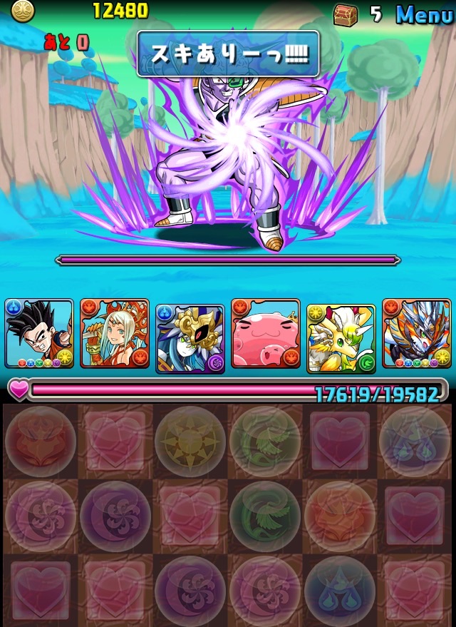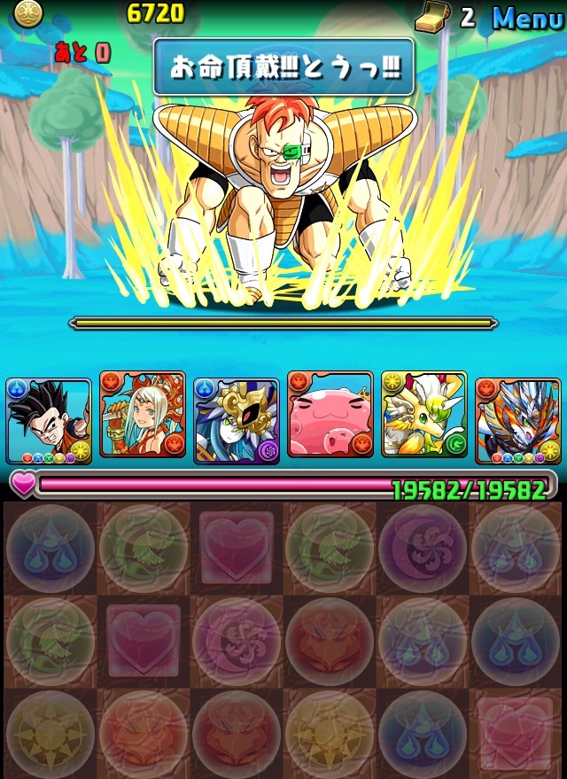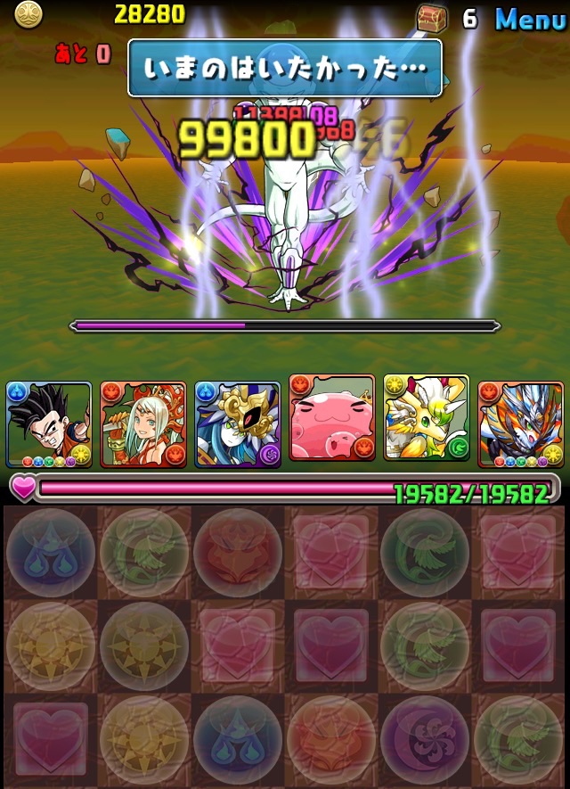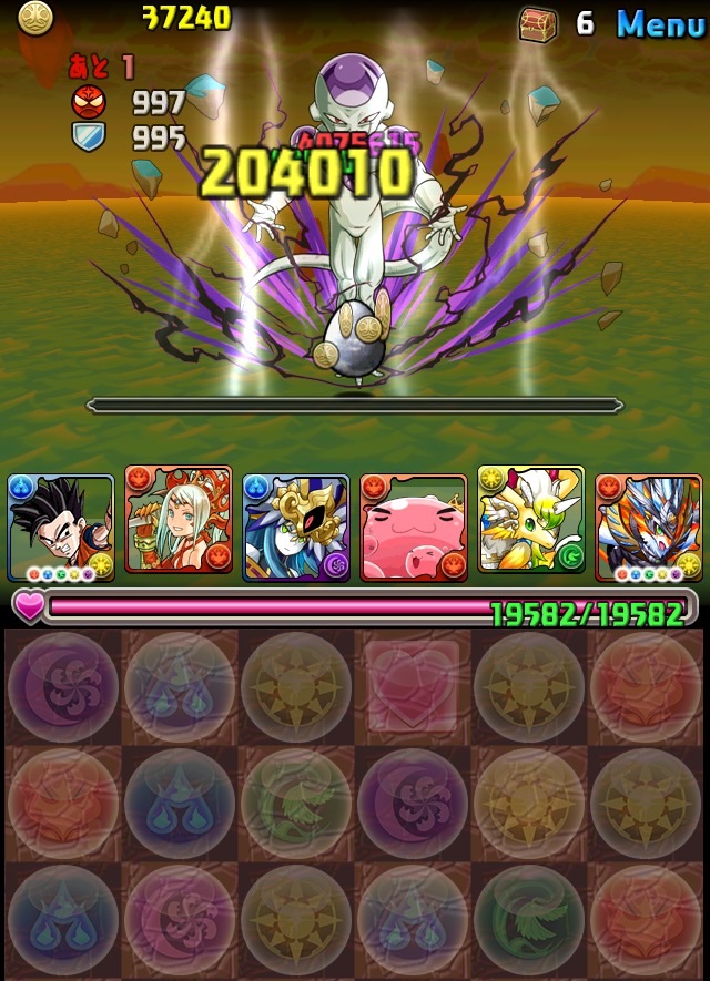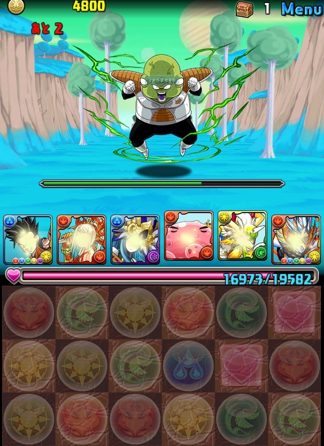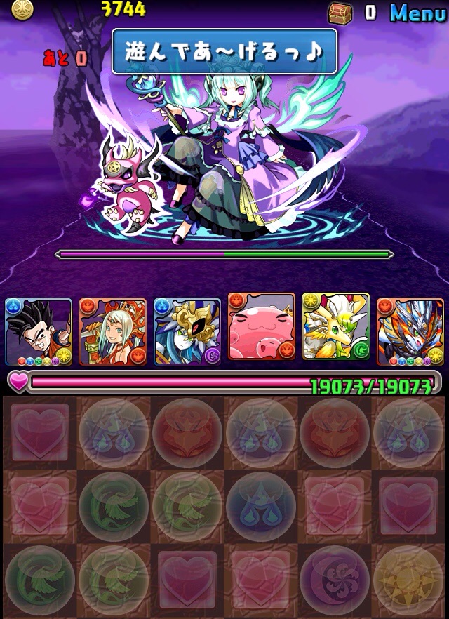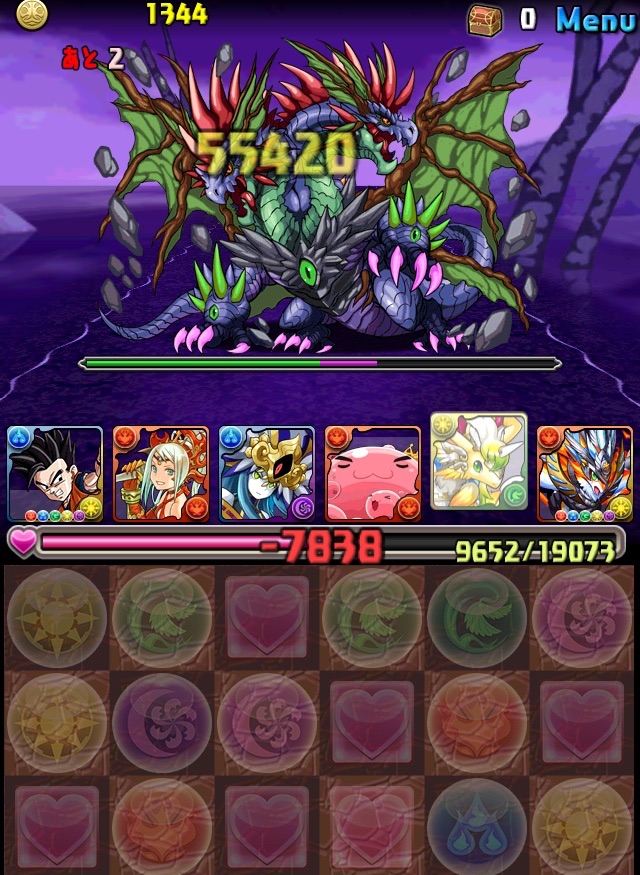 ドロリフで暗闇解除+落ちコンで多少なりダメージ。高防御力で回復ドロップも消して来るし、1発も重いため、非常に手強い。毎ターン5色決めて一気にケリをつけるつもりで、全力パズル!