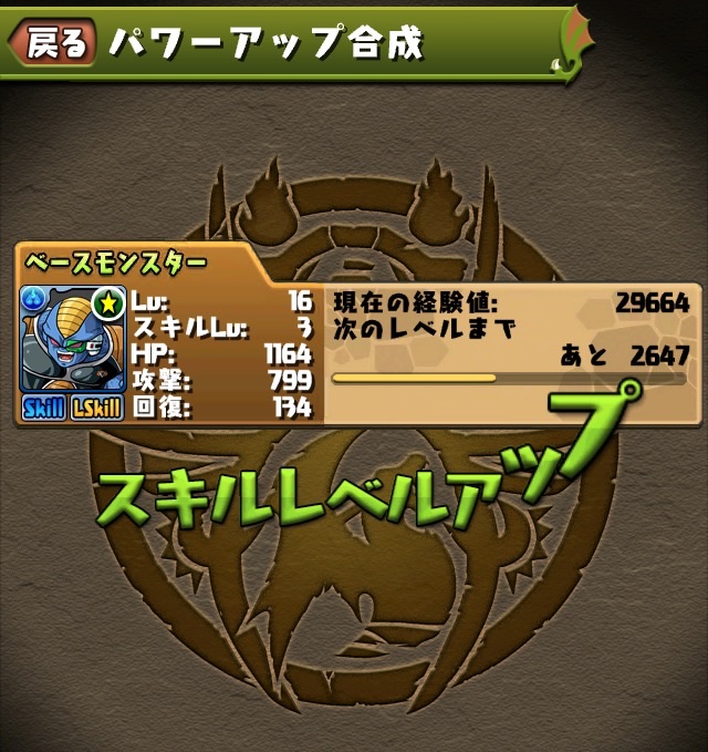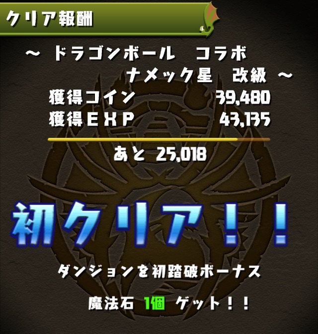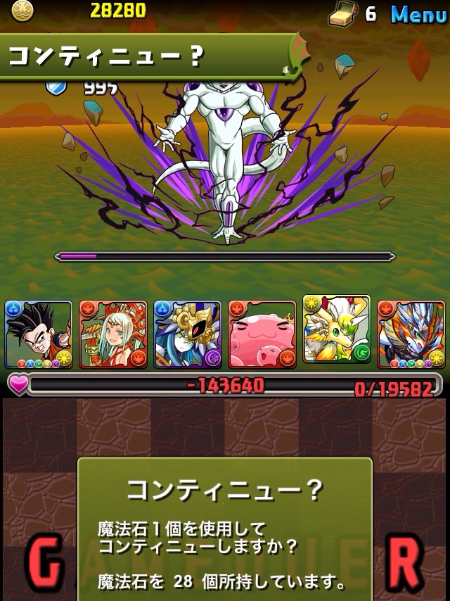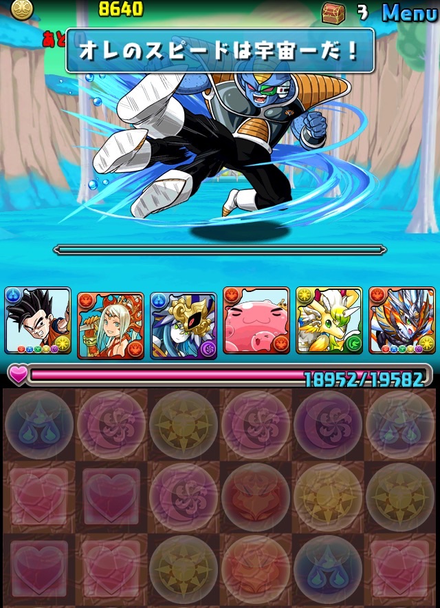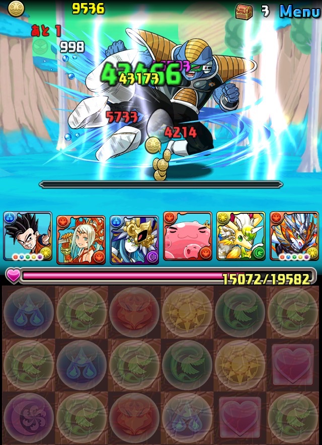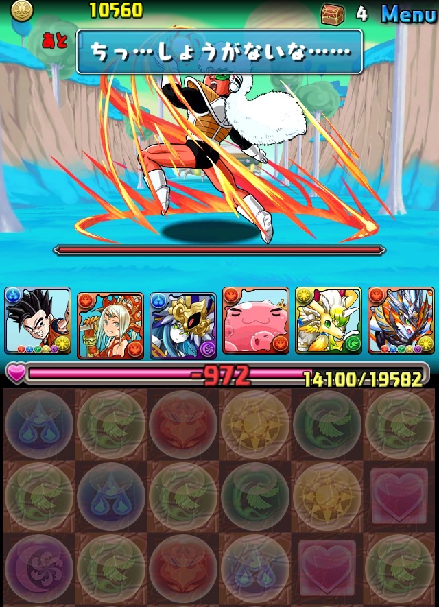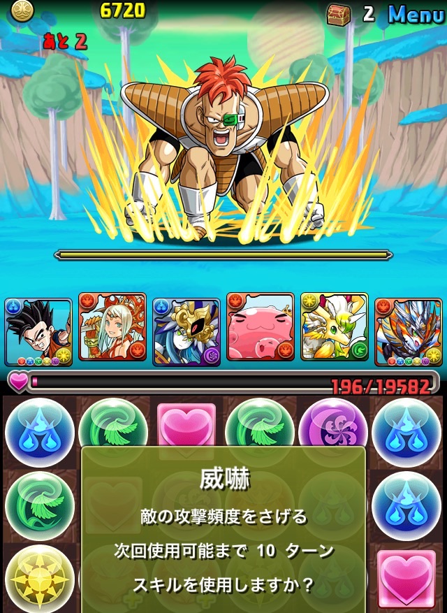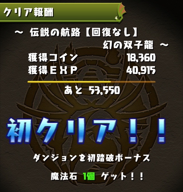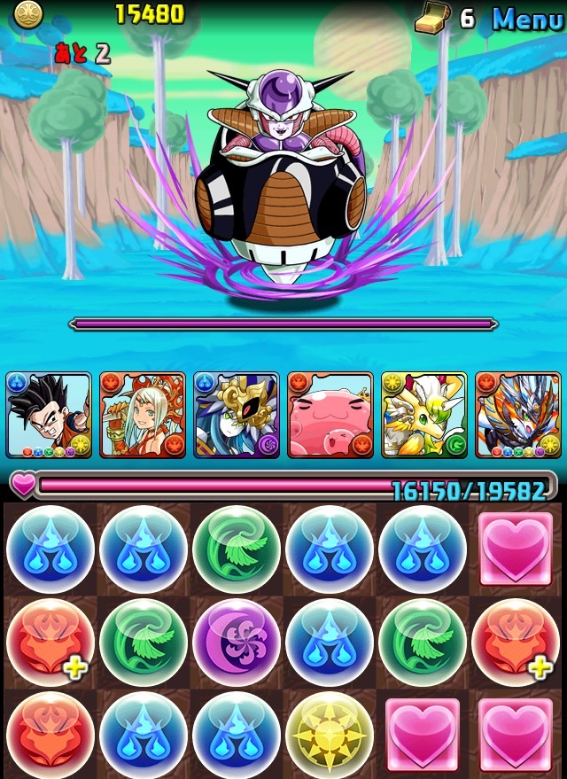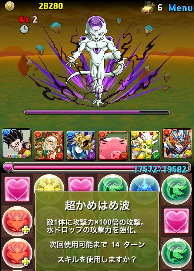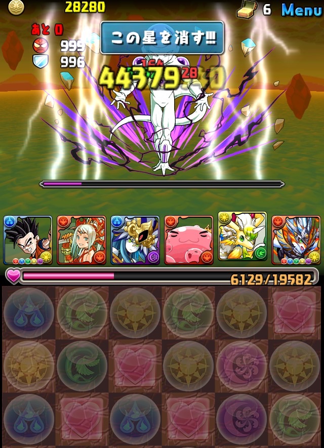 ドロリフで暗闇解除+落ちコンで多少なりダメージ。高防御力で回復ドロップも消して来るし、1発も重いため、非常に手強い。毎ターン5色決めて一気にケリをつけるつもりで、全力パズル!